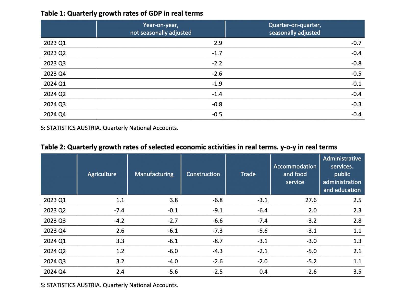 Austria’s economic output declined by 0.5% in the fourth quarter of 2024 compared to the same period in 2023, according to preliminary data from Statistics Austria. On a quarterly basis, seasonally and calendar-adjusted real GDP fell by 0.4% compared to the third quarter of 2024. For the entire year, Austria’s GDP contracted by 1.1% in real terms compared to 2023, marking the country’s longest period of economic weakness since 1995.