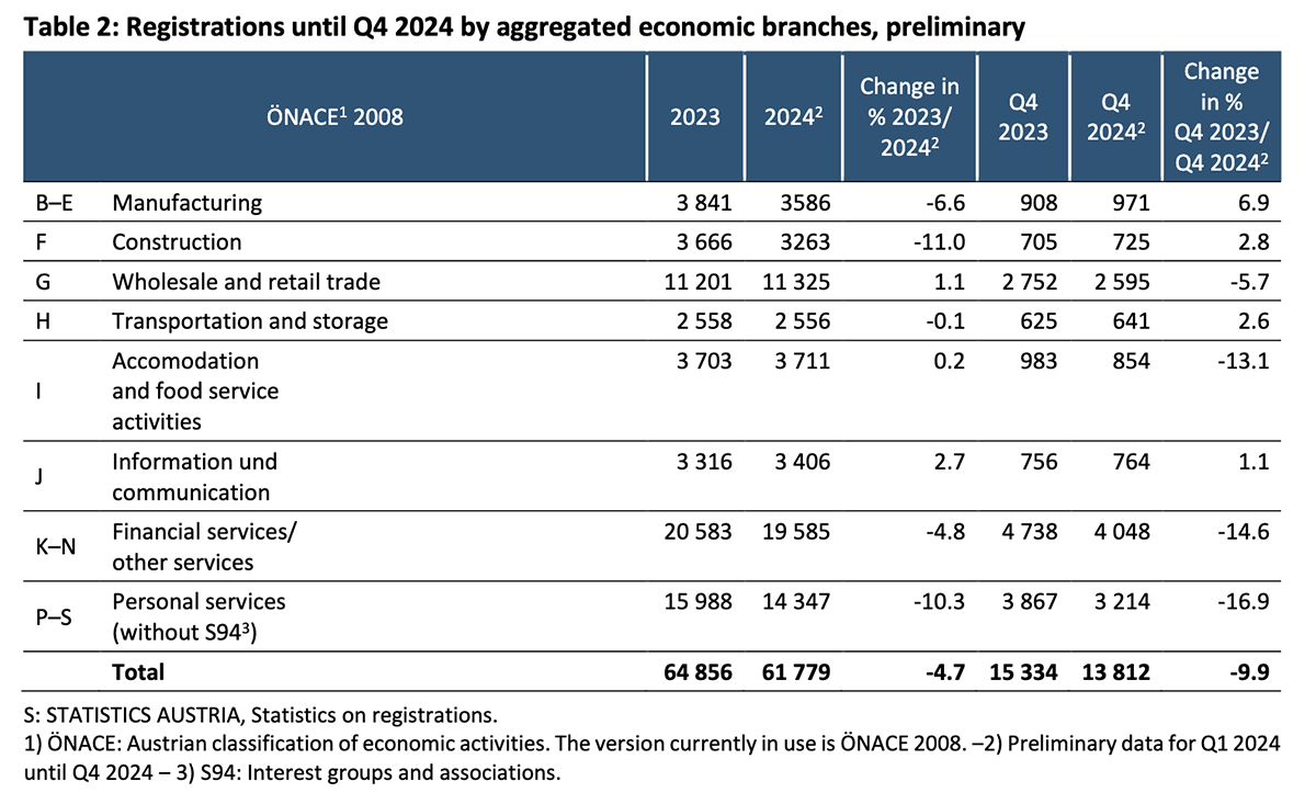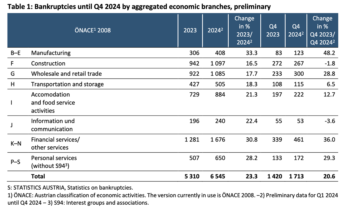 “The ongoing economic crisis and significant uncertainties are driving up insolvencies while dampening business formation,” said Tobias Thomas, Director General of Statistics Austria. “The sharp rise in bankruptcies at the end of 2024 underscores the difficult conditions facing businesses.”