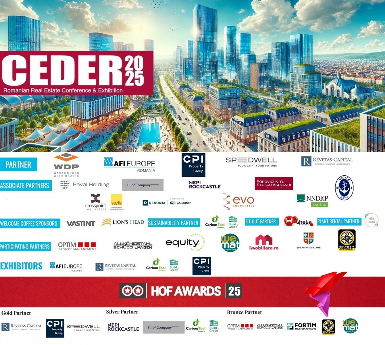 CEDER 2025 Confirmed Partners are: WDP, CPI Property Group, AFI Europe, Revetas, Speedwell, Paval Holding, NEPI Rockcastle, Filip & Company, EVO Properties, Anchor Grup, NNDKP, VASTINT, Popovici, Nitu, Stoica & Asociatii, Crosspoint Real Estate, Lion’s Head, Carbon Tool, Theta Furniture & More, RENOMIA Gallagher, Optim Project Management, WEMAT, Tiriac Imobiliare, Safety Approach, ALUKÖNIGSTAHL, Imobiliare.ro, Notarial Office EQUITY, Miss Green.