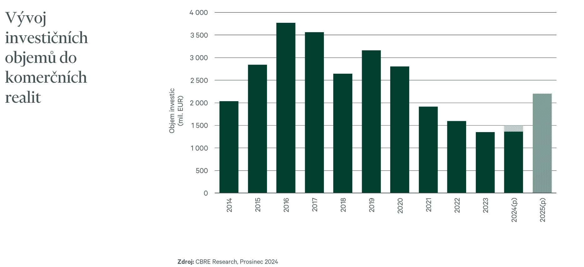 From January to November 2024, €1.36 bln has been transacted, which is already equal to the total volume for 2023. We expect to close this year with a total investment volume of around €1.5 bln. Several large transactions are currently in the final stages of negotiations, hence Q1 2025 is set to be a very strong quarter. CBRE expects total Czech commercial real estate investment volumes to far exceed €2 bln in 2025. Local investors will remain the key players, but the anticipated return of international capital could further strengthen the market.