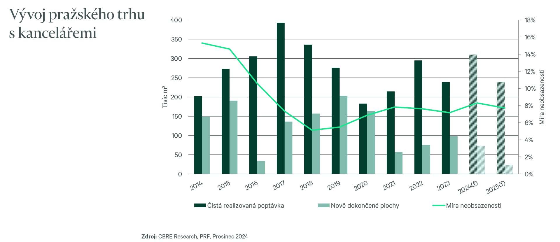 We have seen signs of reviving office construction during 2024. There is currently more than 160,000 sq m of new office space under construction in Prague, although most of this space won’t be completed until 2027. The recovery of office construction is being led by the owner-occupied market, namely two of the largest Czech business institutions, however, we believe this may be the trigger for other projects to follow suit. We anticipate a supply gap in 2025 and 2026, during which only a total of 23,000 sq m is scheduled to be completed.