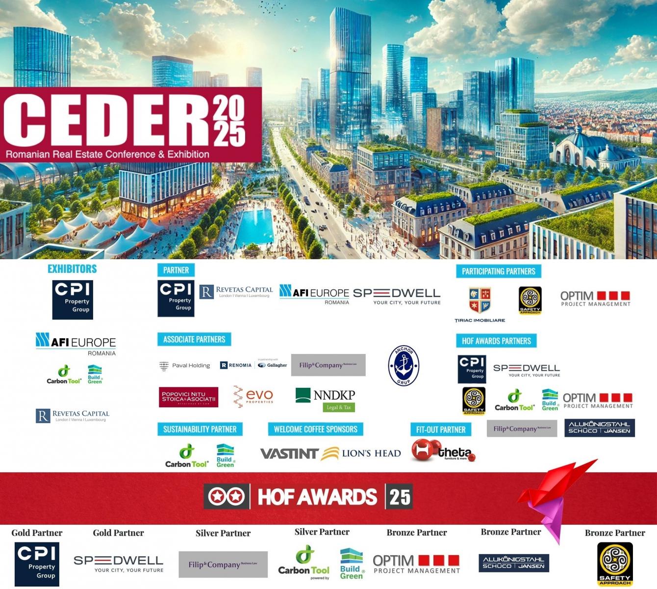 CEDER 2025 Confirmed Partners are: CPI Property Group, AFI Europe, Revetas Capital, Speedwell, Paval Holding, Filip & Company, EVO Properties, Anchor Grup, NNDKP, VASTINT, Popovici, Nitu, Stoica & Asociatii, Lion’s Head, Carbon Tool, Theta Furniture & More, RENOMIA Gallagher, Optim Project Management, Safety Approach, ALUKÖNIGSTAHL, Tiriac Imobiliare.