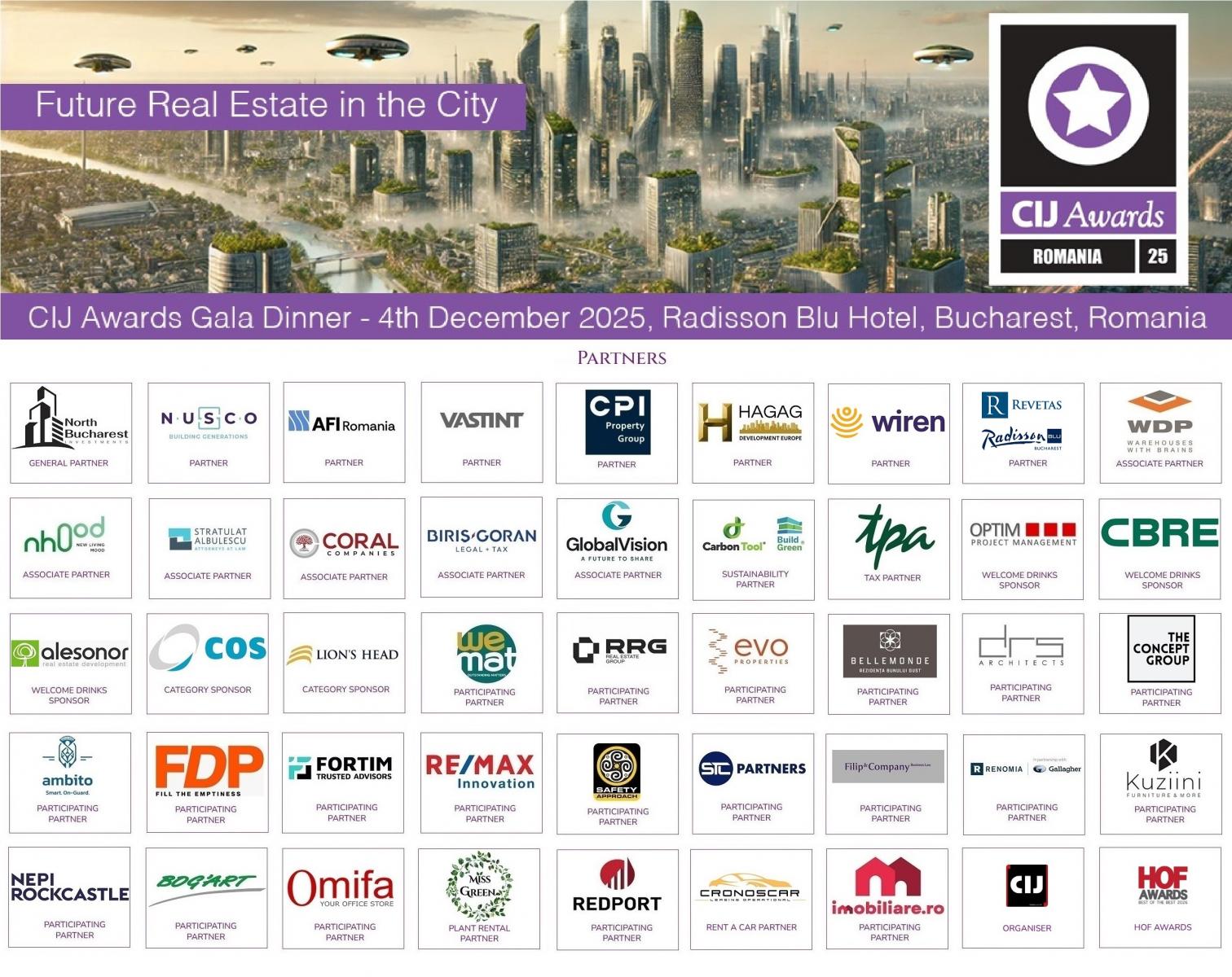 We extend a special thank-you to our confirmed Partners this year: North Bucharest Investments, AFI Romania, CPI Property Group, VASTINT, Hagag Development Europe, Revetas, WIREN, NUSCO, WDP, Global Vision, Biris Goran, NHOOD, TPA Romania, Stratulat Albulescu Attorney at Law, Coral Construct, Lion’s Head, Carbon Tool, Alesonor, Optim Project Management, COS, CBRE, RRG Real Estate Group, WEMAT, Bellemonde, Safety Approach, REDPORT, RENOMIA Gallagher, EVO Properties, Filip & Company, Imobiliare.ro, Fortim Trusted Advisors, DRS Architects, RE/MAX Innovation, Bog’Art, Cronoscar, Miss Green, STC Partners, Fabrica de Profile, Ambito, Omifa, NEPI Rockcastle, KUZIINI, The Concept Group.