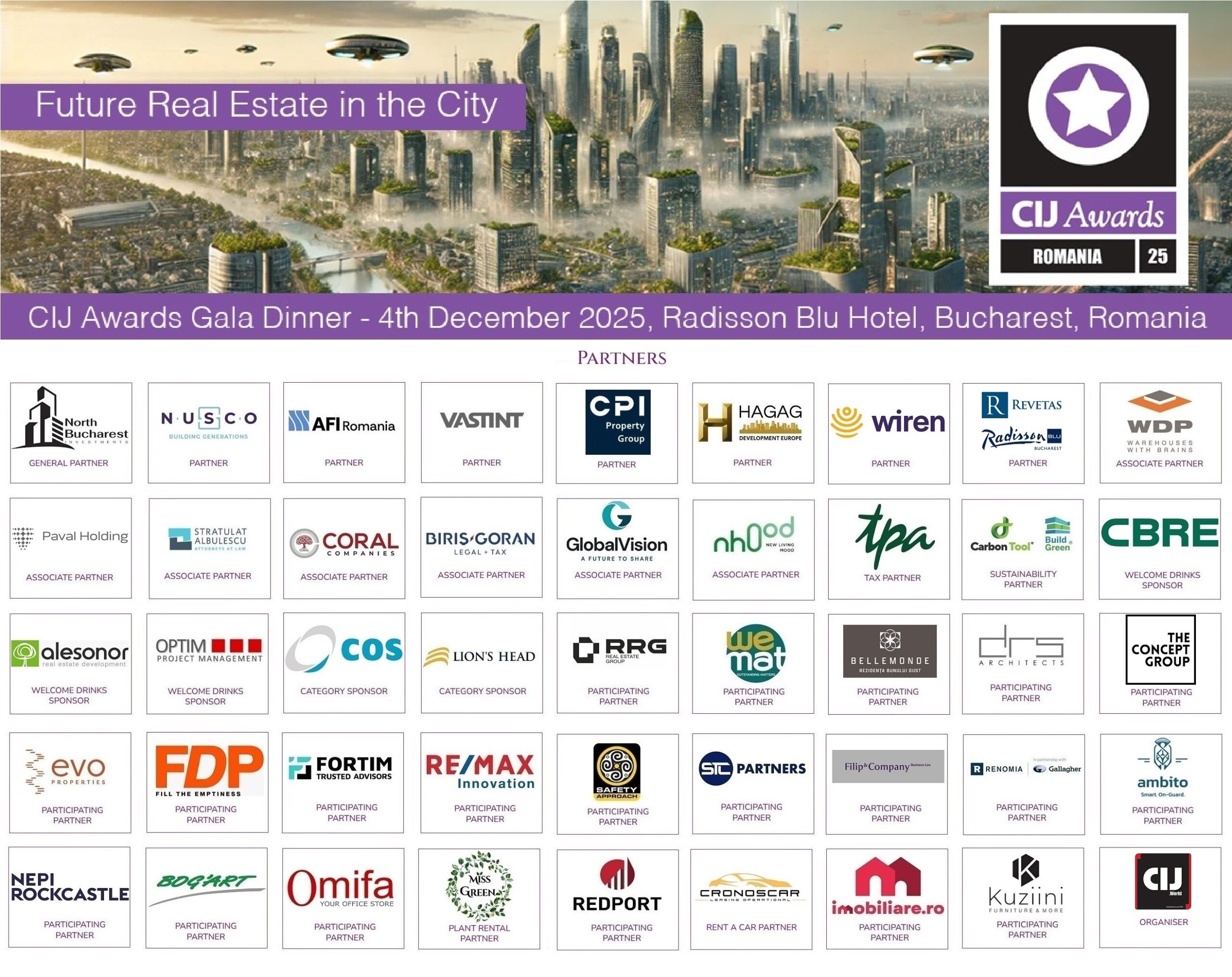 North Bucharest Investments, AFI Romania, CPI Property Group, VASTINT, Hagag Development Europe, Revetas, WIREN, NUSCO, WDP, PAVAL HOLDING, Global Vision, Biris Goran, NHOOD, TPA Romania, Stratulat Albulescu Attorney at Law, Coral Construct, Lion’s Head, Carbon Tool, Alesonor, Optim Project Management, COS, CBRE, RRG Real Estate Group, WEMAT, Bellemonde, Safety Approach, REDPORT, RENOMIA Gallagher, EVO Properties, Filip & Company, Imobiliare.ro, Fortim Trusted Advisors, DRS Architects, RE/MAX Innovation, Bog’Art, Cronoscar, Miss Green, STC Partners, Fabrica de Profile, Ambito, Omifa, NEPI Rockcastle, KUZIINI, The Concept Group.