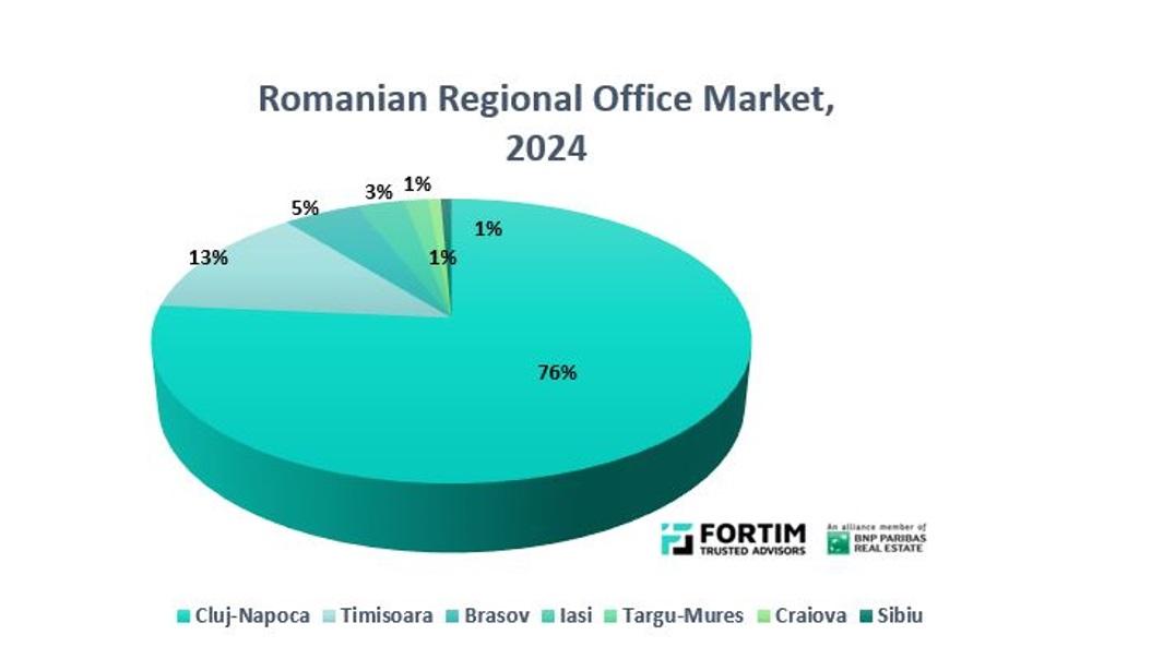 Cluj-Napoca, February 2025 – Cluj-Napoca dominated Romania’s regional office market in 2024, accounting for 76% of all modern office space leased outside Bucharest. Companies secured a total of 48,008 square meters of office space in Cluj-Napoca, marking a fourfold increase compared to 2023, according to an analysis by Fortim Trusted Advisors, a member of the BNP Paribas Real Estate Alliance.
