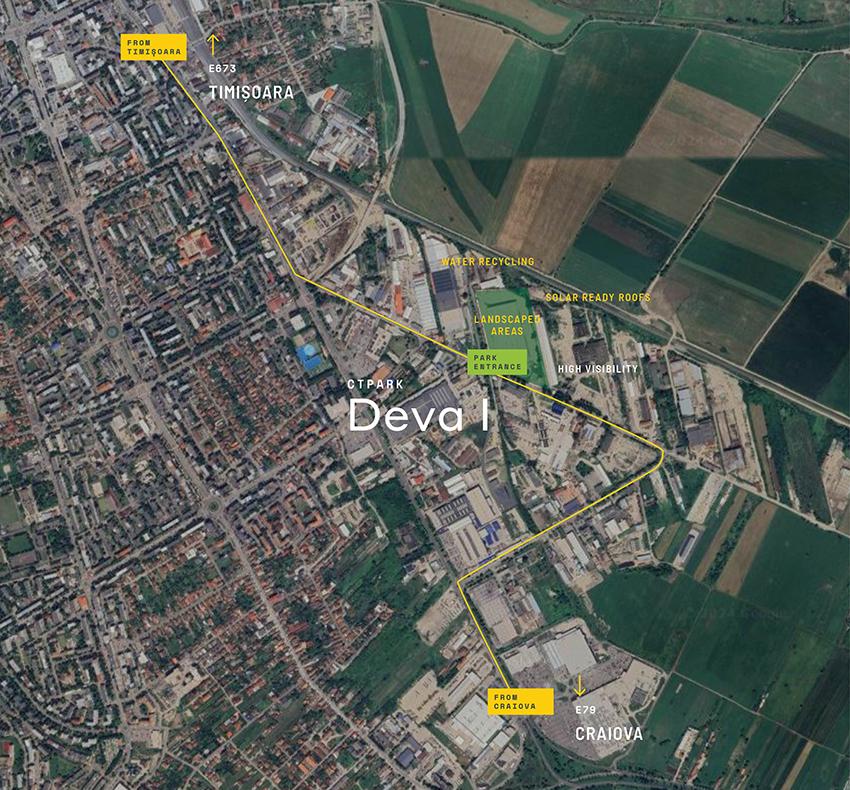 CTPark Deva offers direct access to the A1 Sibiu-Deva Motorway, located just 2 km from the city center, making it ideal for logistics and manufacturing activities. The park also features cross-docking facilities and easy access to public transportation.