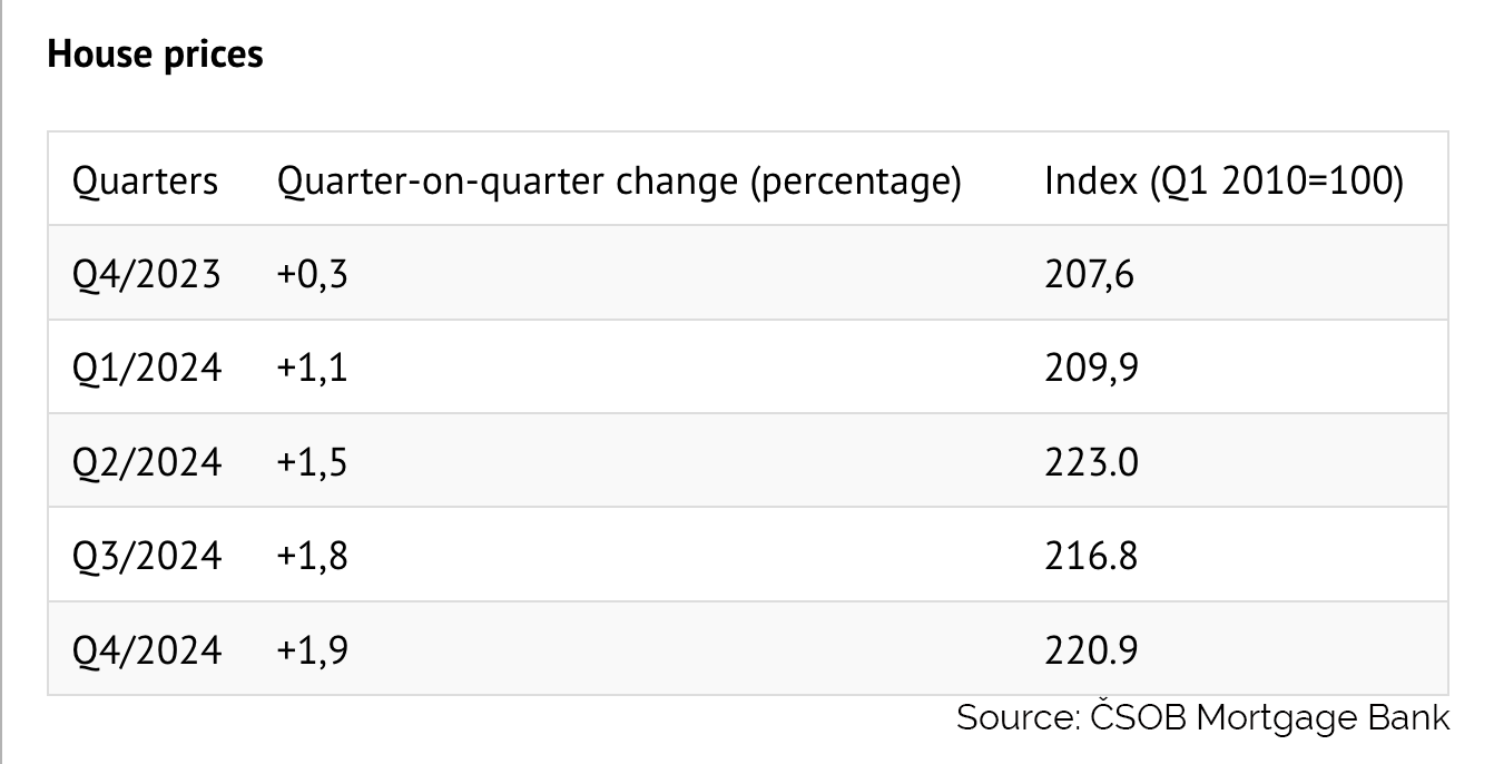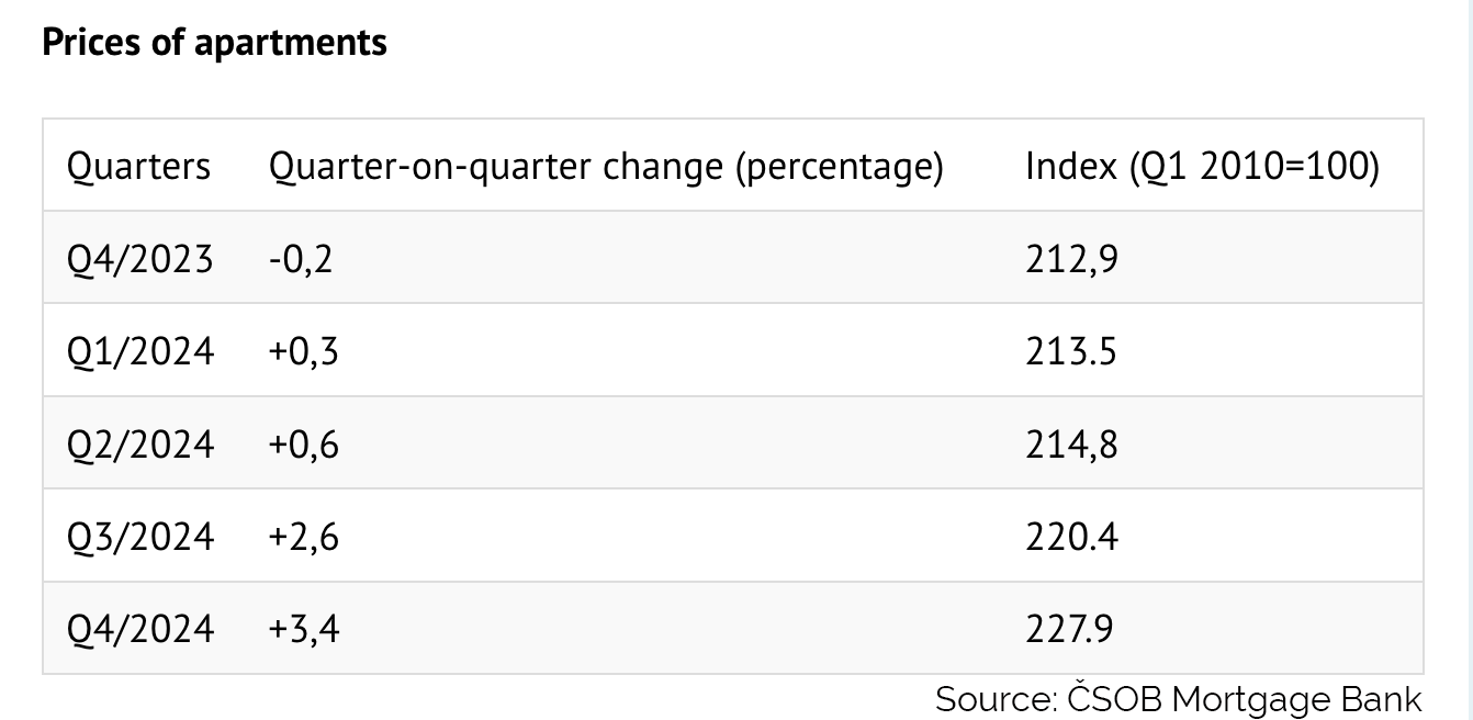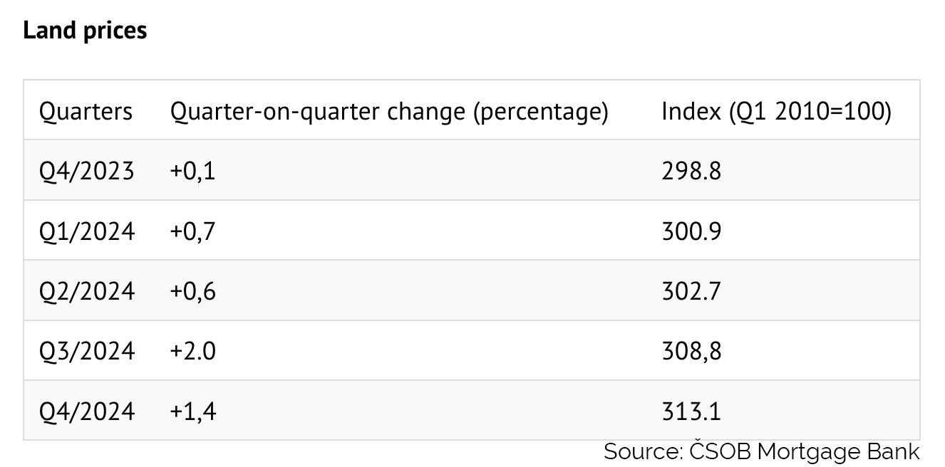 Real estate prices in the Czech Republic increased at the end of 2024, with apartments experiencing the highest growth. According to data from the ČSOB Housing Index, apartment prices rose by seven percent year-on-year in the fourth quarter. Family home prices increased by 4.8 percent, while land prices climbed by 6.4 percent compared to the last quarter of 2023. Prices also rose on a quarterly basis, with apartments seeing the largest increase of 3.4 percent, houses rising by 1.9 percent, and land by 1.4 percent compared to the third quarter.