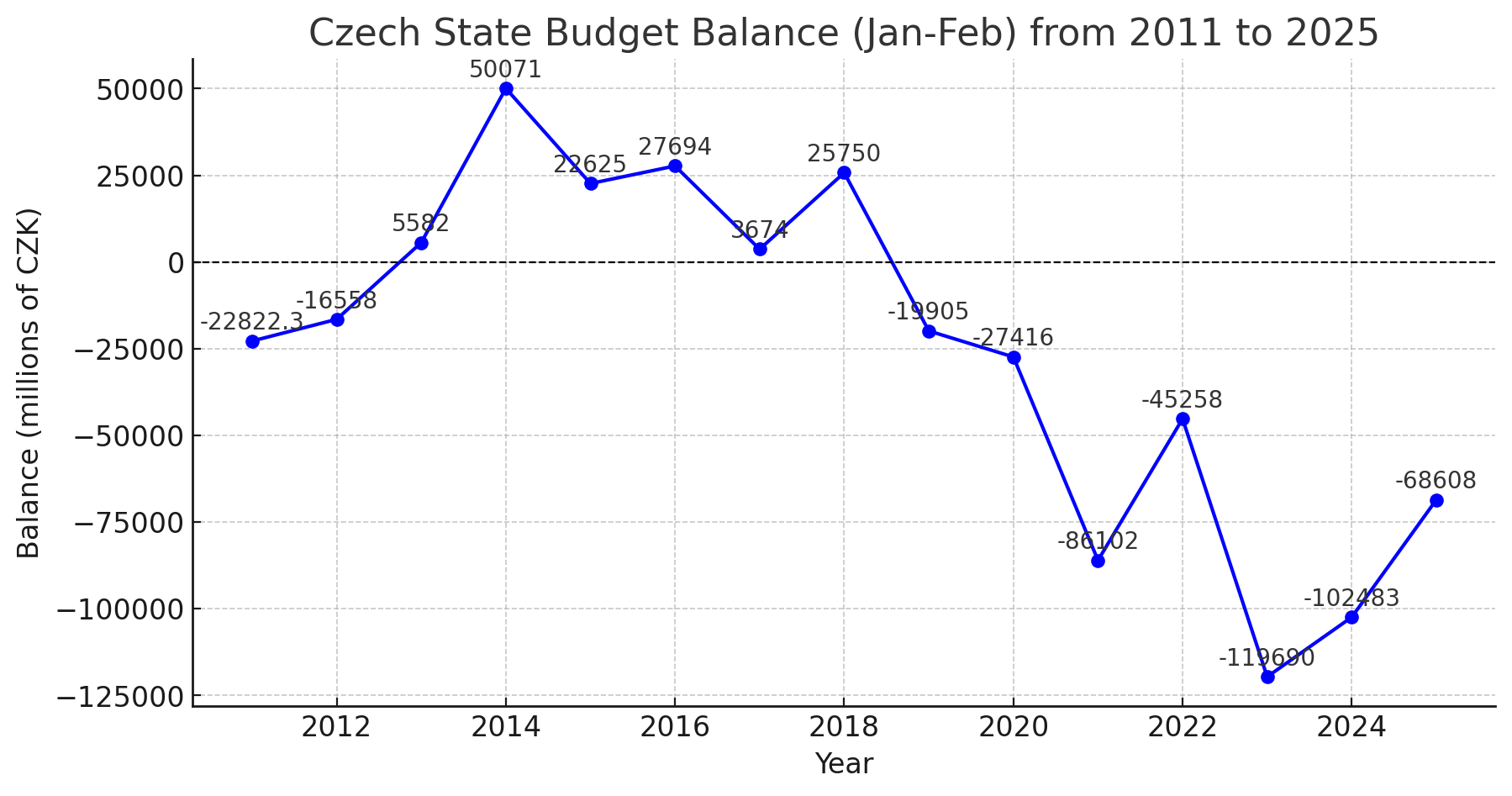 For 2025, the state budget is set with revenues of CZK 2.086 trillion and expenditures of CZK 2.327 trillion, resulting in a planned deficit of CZK 241 billion. In 2024, the budget ended with a deficit of CZK 271.4 billion, the lowest since the start of the COVID-19 pandemic but still the fifth-largest in Czech history.