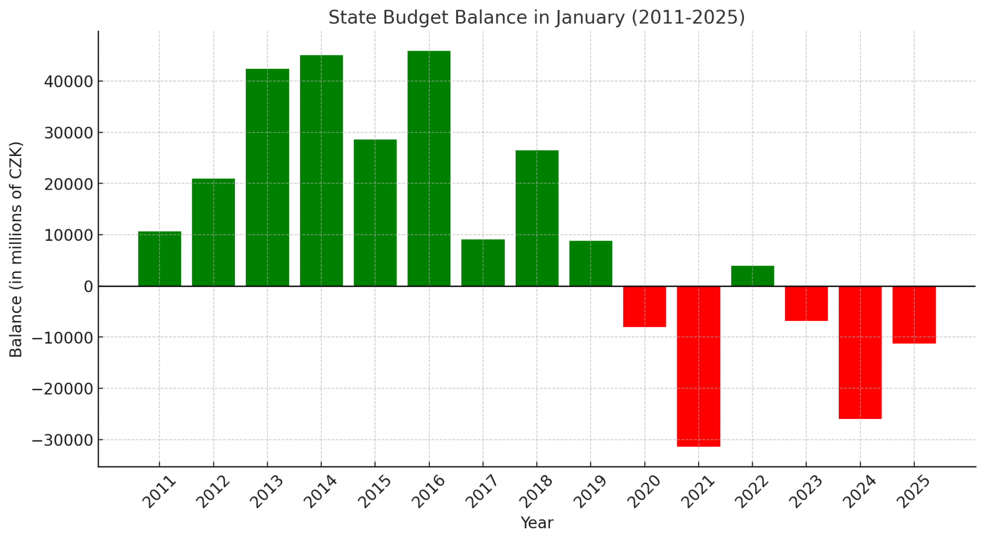 According to the Ministry of Finance, budget revenues in January reached CZK 161.8 billion, marking a 9.7% year-on-year increase. Meanwhile, expenditures slightly decreased by 0.3% to CZK 173 billion.