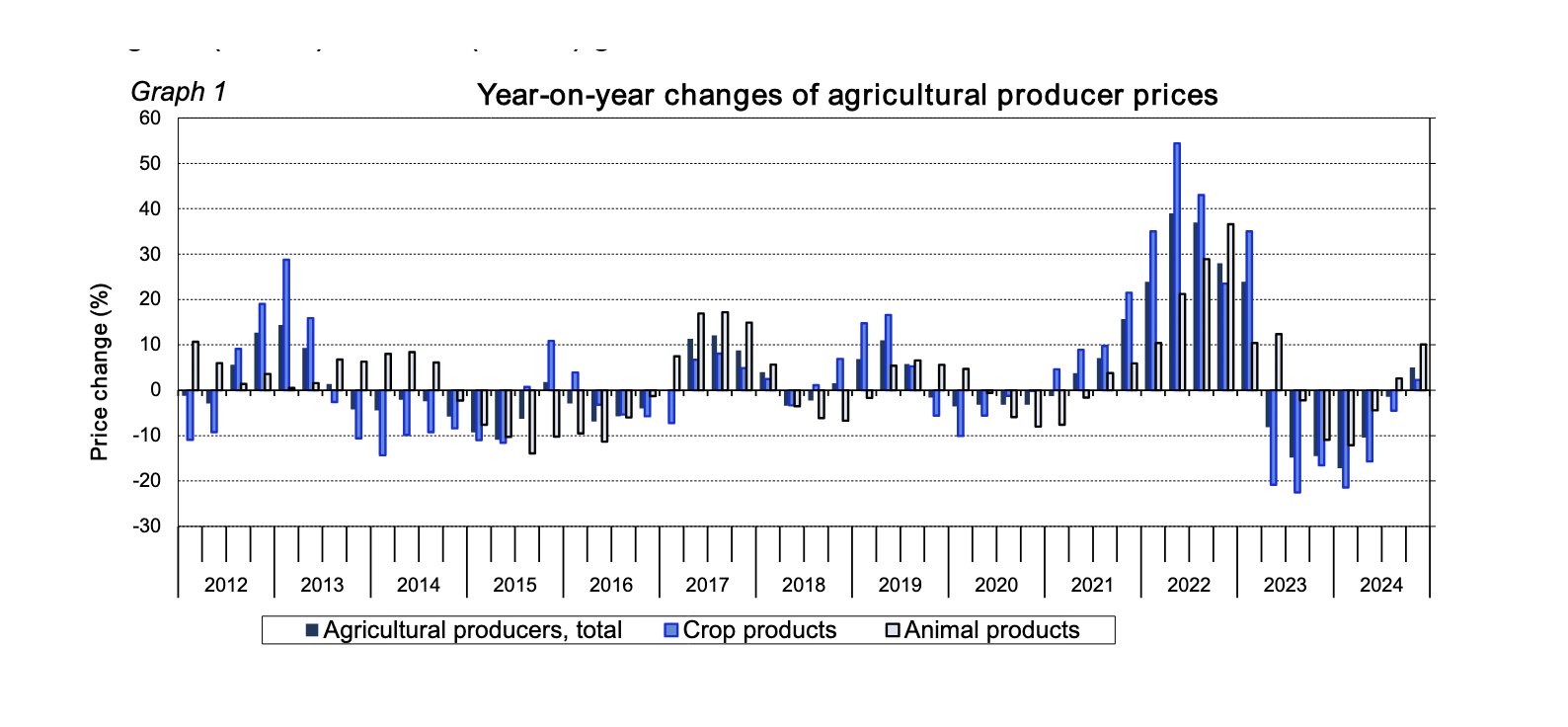 In the fourth quarter of 2024, producer prices across multiple sectors in the Czech Republic experienced notable trends compared to the previous quarter and the same period in 2023. Agricultural producer prices rose by 6.8% quarter-on-quarter (q-o-q) and by 5.0% year-on-year (y-o-y). Key contributors to the increase included higher prices for eggs (+26.5%), milk (+8.1%), and oilseeds (+7.5%), while declines were seen in fruit (-4.6%) and slaughter pigs (-3.9%). Over the entire year, agricultural producer prices dropped by 5.9%, with significant declines in crop production (-9.1%) and animal production (-1.5%).