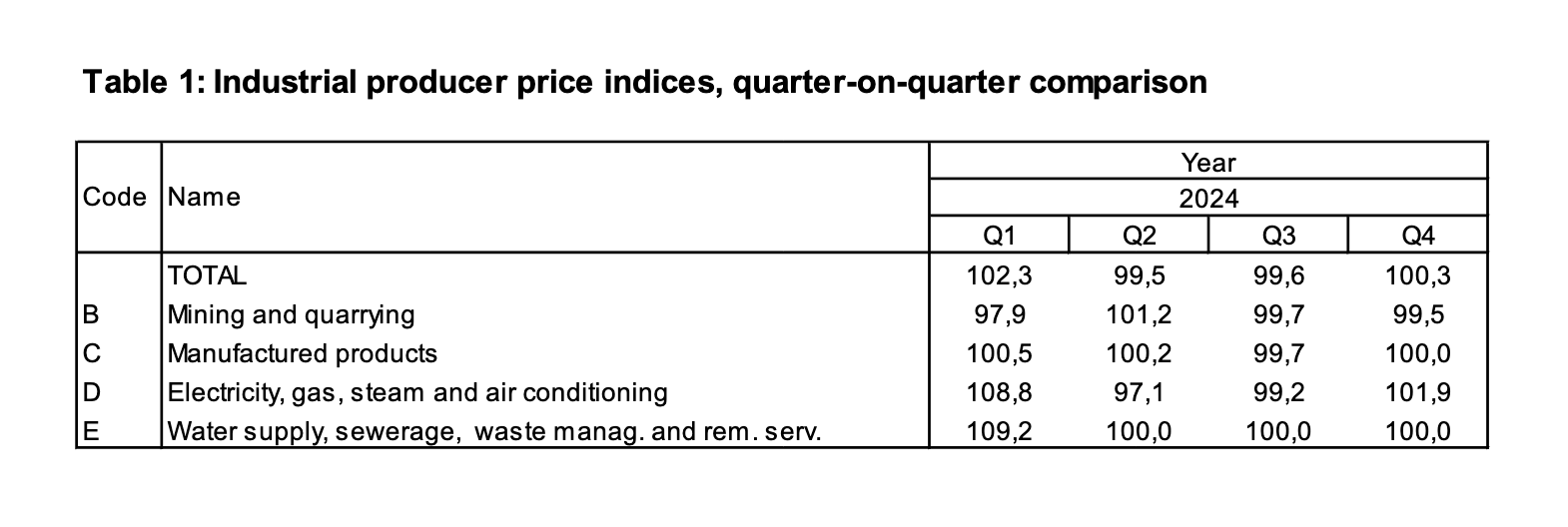 Industrial producer prices increased slightly by 0.3% q-o-q in Q4 2024, driven by higher prices in electricity, gas, steam, and air conditioning (+1.9%), and paper and electronic products (+1.5%). However, prices for crude petroleum and natural gas fell significantly (-3.3%). On a y-o-y basis, industrial producer prices rose by 1.8% in Q4, with notable increases in water treatment services (+9.2%) and electricity (+6.7%). Across 2024, the annual rise in industrial producer prices averaged 0.8%, marking a decline from the 5.0% increase seen in 2023.