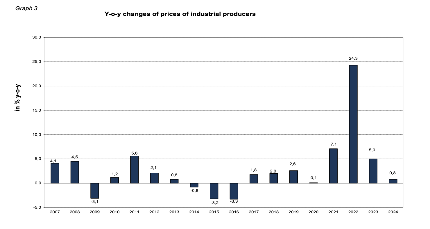 Construction work prices grew by 0.7% q-o-q in Q4 2024 and by 2.4% y-o-y, reflecting moderate activity in the sector. For the full year, construction prices increased by 2.1%, a deceleration from the 5.9% growth in 2023. Input prices for construction materials dropped by 0.5%, reversing the upward trend of the previous year.