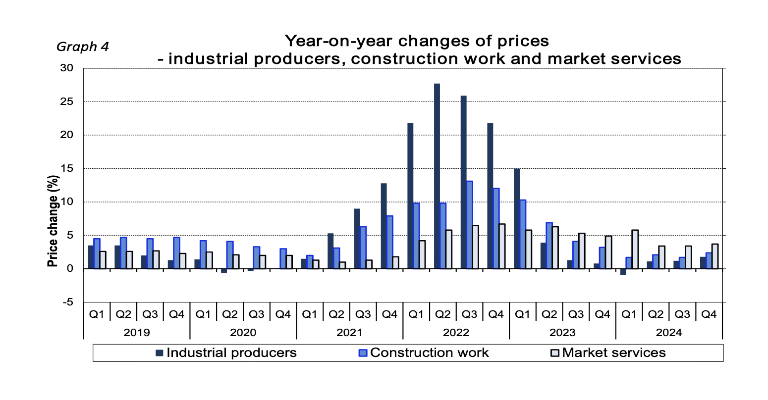 Service producer prices in the business sector rose by 1.5% q-o-q in Q4 2024 and by 3.7% y-o-y. Significant contributors to the increase included advertising and market research services (+18.3%) and programming and broadcasting services (+19.6%). Excluding advertising services, prices rose by 0.3% q-o-q and 3.1% y-o-y. For the entire year, service producer prices grew by 3.8%, with advertising, employment, and real estate services among the largest contributors.