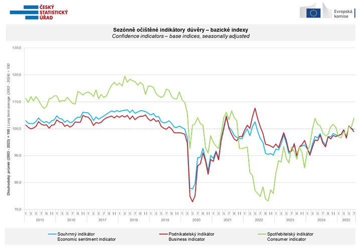 The overall confidence indicator fell by 0.4 points month-on-month (m-o-m) to 99.7. Business confidence declined by 1.2 points to 98.8, dropping below the long-term average, while consumer confidence rose by 3.4 points to 104.1—its highest level since November 2021. All indicators remain higher than they were in July 2024.