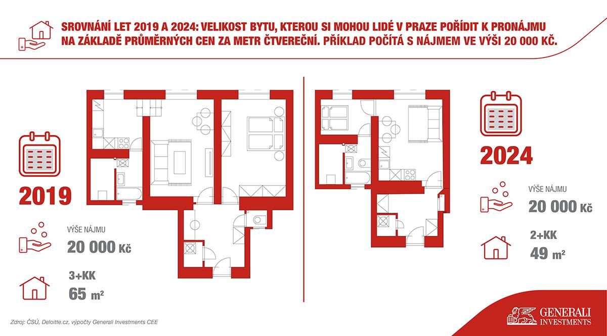 The deterioration in the rental market is clear. In 2019, tenants in Prague could rent a 65-square-meter apartment for CZK 20,000. Today, for the same amount, renters can only secure a 49-square-meter apartment. This represents a 16-square-meter reduction in living space, according to data from the Czech Statistical Office and Deloitte.