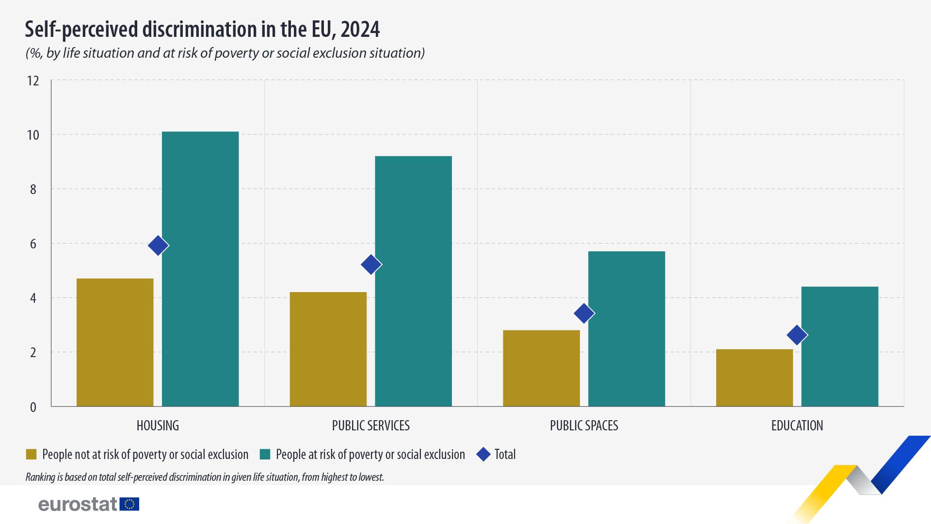 A key finding of the survey is the disparity between those at risk of poverty or social exclusion (AROPE) and the rest of the population. Among those identified as AROPE, 10.1% reported discrimination in their search for housing—more than double the rate of those not at risk (4.7%). Similarly, 9.2% of individuals at risk felt discriminated against when engaging with public services, compared to 4.2% of those not facing such economic or social hardship.