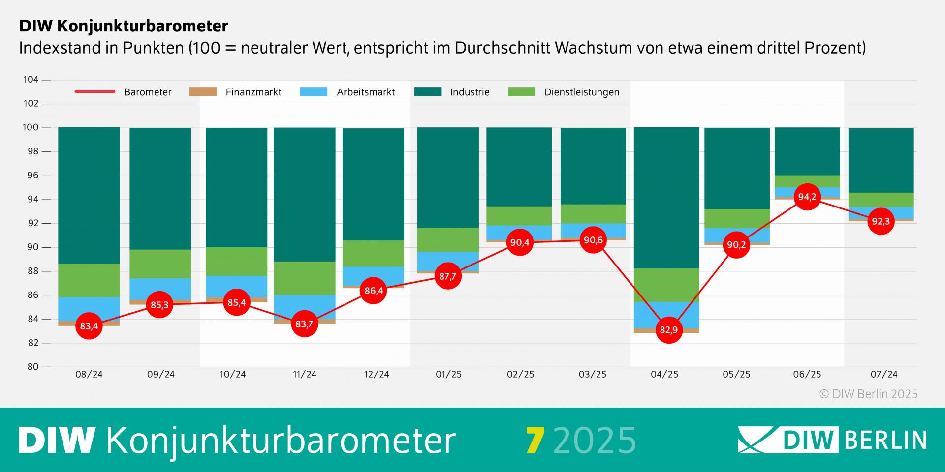 Germany’s economic recovery remains uneven, according to the latest data from the German Institute for Economic Research (DIW Berlin). The DIW Economic Barometer for July dropped slightly to 92.3 points, down from 93.2 in June, moving further below the neutral 100-point benchmark that signals average economic growth.