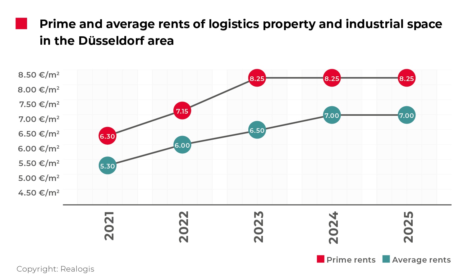 Overall, the Düsseldorf logistics and industrial property market in 2025 was characterised by stable rental conditions, strong demand for large distribution facilities and a clear shift away from greenfield developments towards existing buildings and brownfield regeneration. Total tenant take-up amounted to 299,000 square metres, with prime and average rents holding steady at €8.25 and €7.00 per square metre respectively.