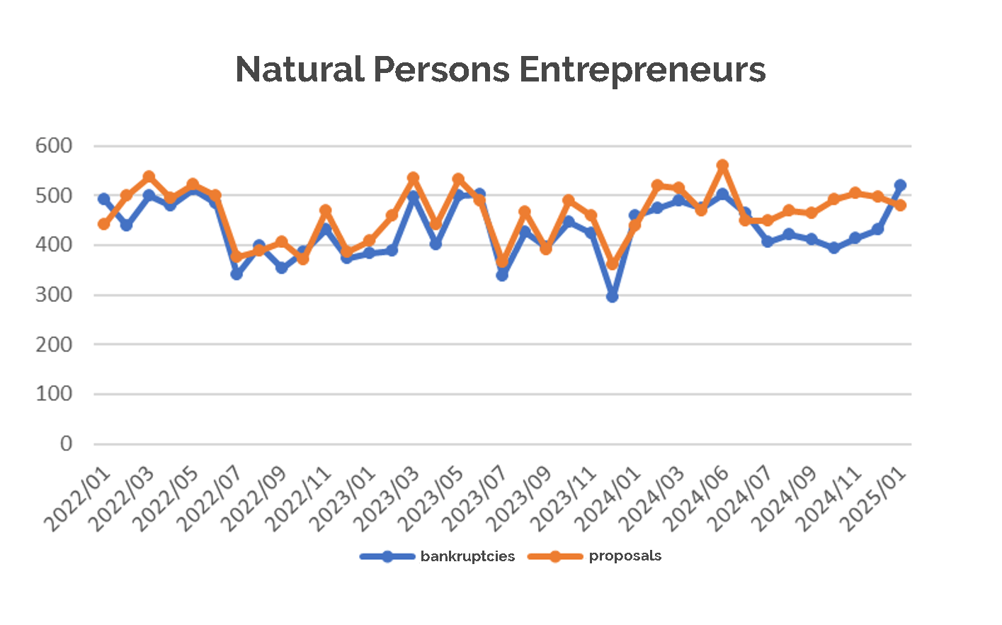 The rise in bankruptcies follows a period of decline in previous years, but since mid-2024, the number of entrepreneurs has started to grow again. While credit activity has resumed, entrepreneurs’ savings remain three times higher than their debt, indicating cautious financial behavior.