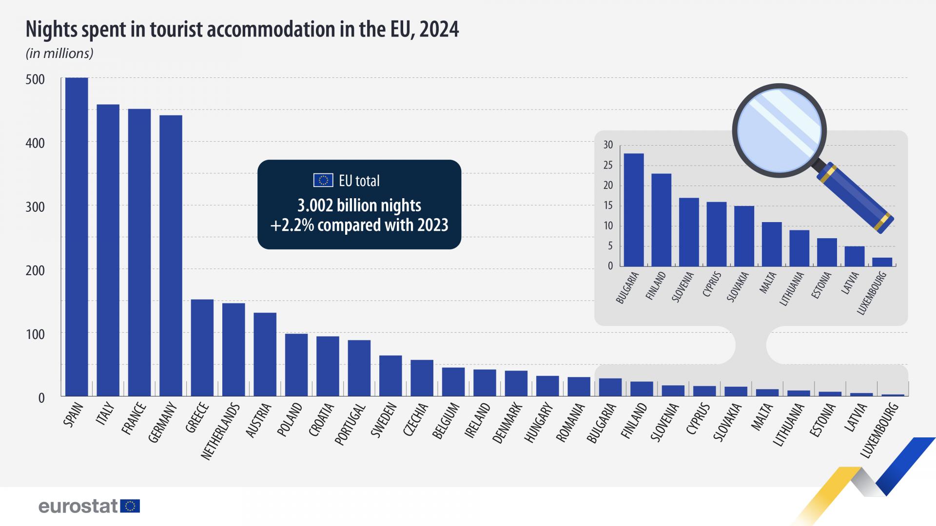 The European Union recorded its highest-ever tourism figures in 2024, with the total number of nights spent at tourist accommodation establishments exceeding 3 billion. This marks a 2.2% increase compared to 2023, amounting to an additional 65.4 million nights. The surge was largely driven by a strong final quarter of the year, which saw a notable rise in overnight stays across almost all EU countries.