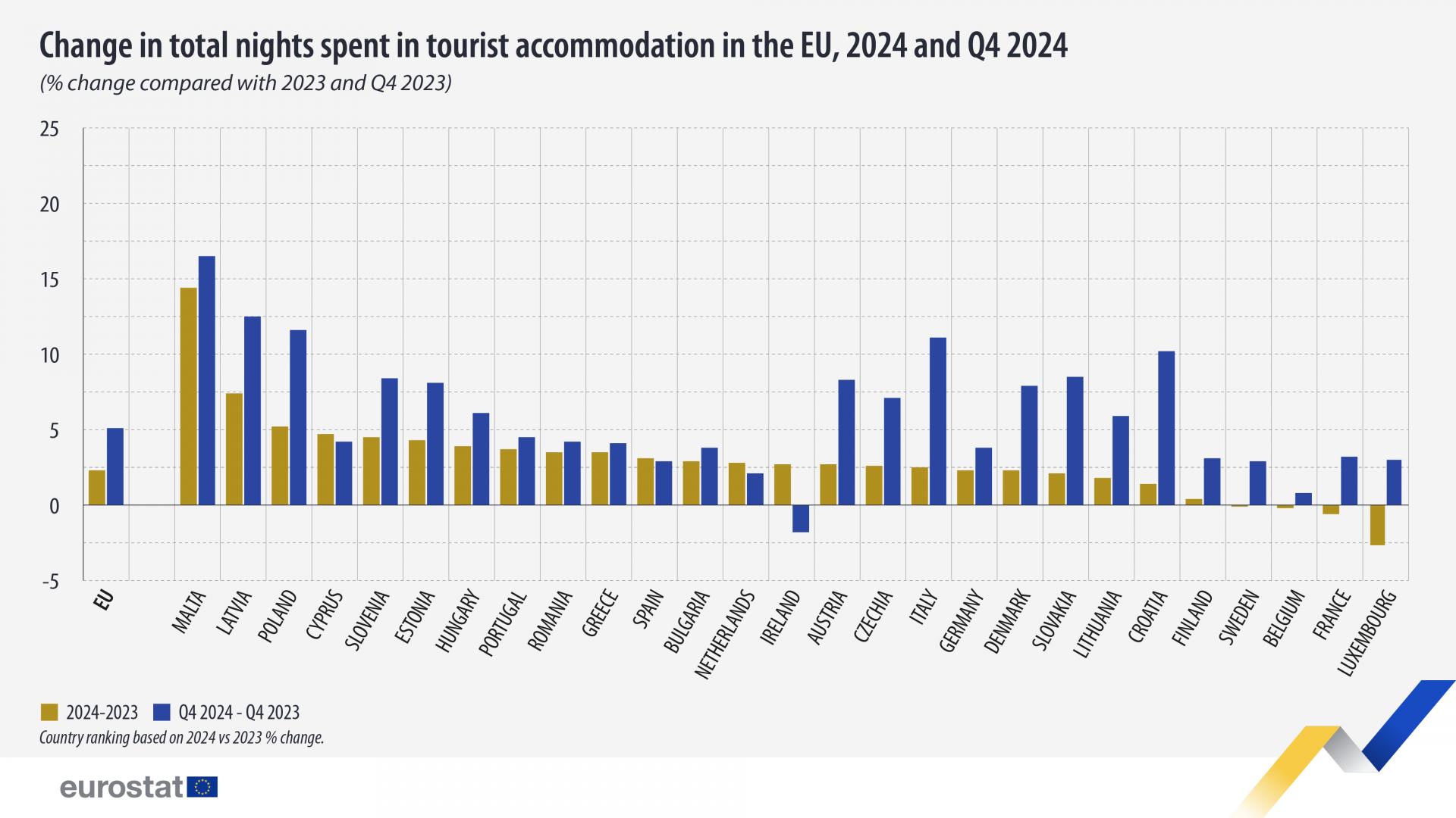 Most EU countries saw an increase in overnight stays during Q4 2024, with Malta experiencing the highest growth (+16.5%), followed by Latvia (+12.5%), Italy (+11.1%), and Croatia (+10.2%). Ireland was the only country to record a decline, with a 1.8% drop compared to the same period in 2023.