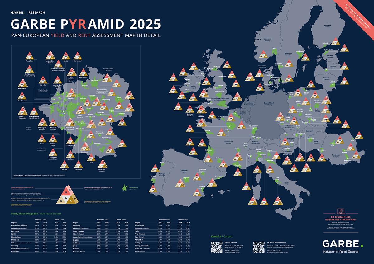 The GARBE PYRAMID MAP, which analyzes 121 key logistics submarkets in 25 European countries, reveals that yields remained stable or declined in 111 regions. In 46 of these areas, net initial yields fell by 10 to 20 basis points in the second half of 2024. In 65 regions, yield levels were unchanged, while only ten locations, including seven in Germany, recorded a modest yield increase.