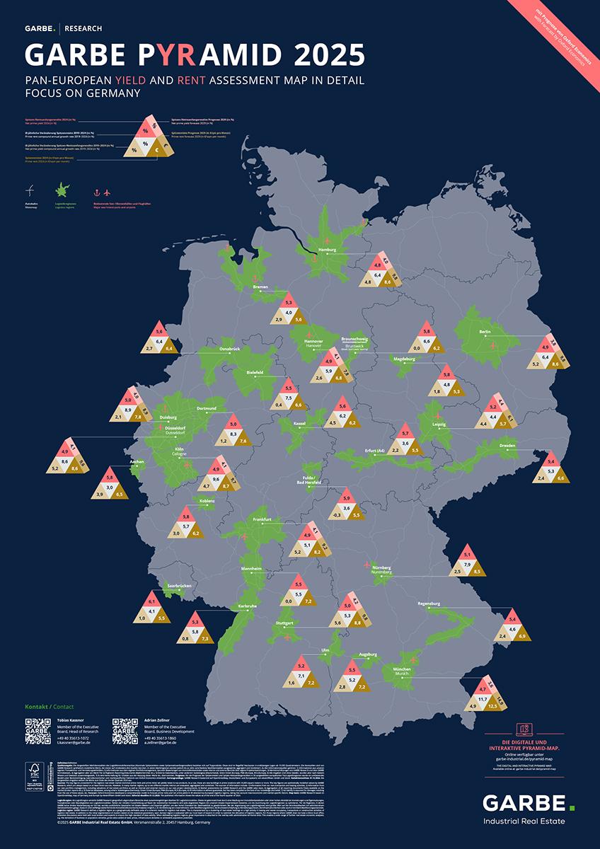 According to Tobias Kassner, Head of Market Intelligence and Sustainability at GARBE, the latest GARBE PYRAMID MAP indicates an incipient trend reversal in logistics real estate investment. While geopolitical and economic uncertainties continue to influence investor sentiment, demand remains strong for assets in prime locations with long-term leases. Sustainability and energy availability are also playing a key role in investment decisions, as ESG compliance remains a top priority.