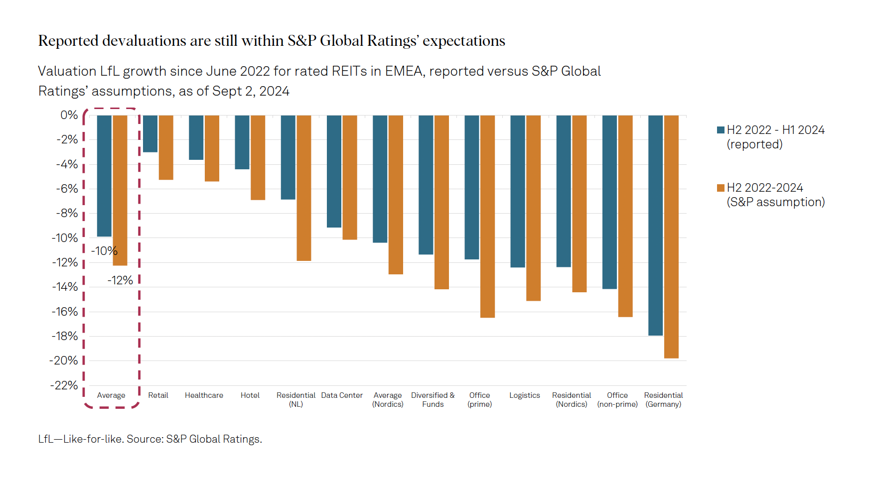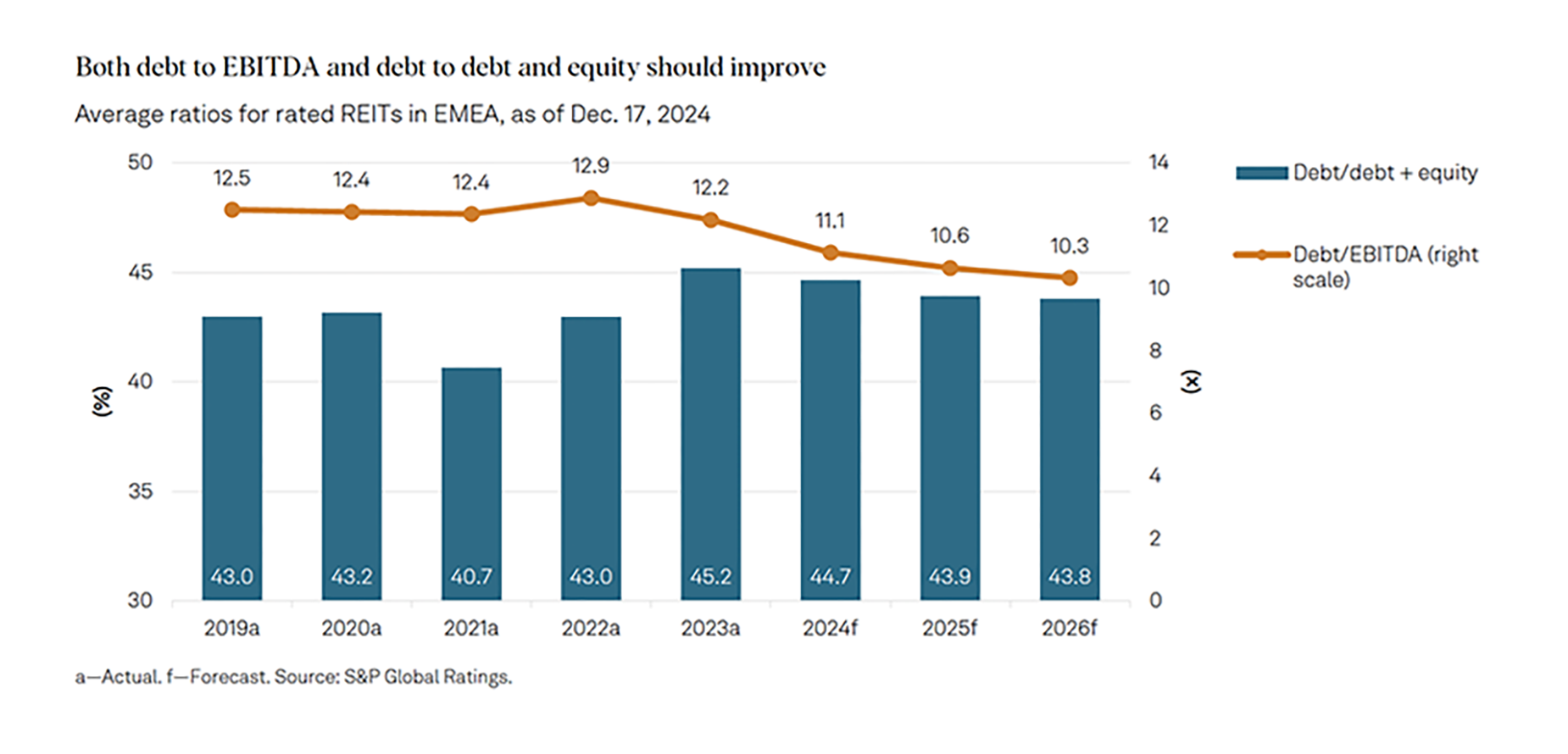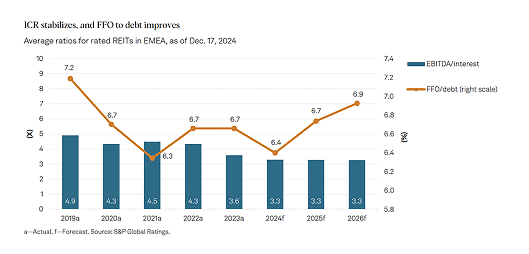 Despite challenges, credit metrics for European REITs show resilience. Interest coverage ratios (ICRs) are expected to stabilize around 3.3x by the end of 2025, reflecting hedged debt profiles and declining borrowing costs. Debt-to-EBITDA ratios are also projected to improve as rental income grows and debt-funded investments remain limited. However, risks remain, including the possibility of opportunistic acquisitions and dividend increases delaying deleveraging.