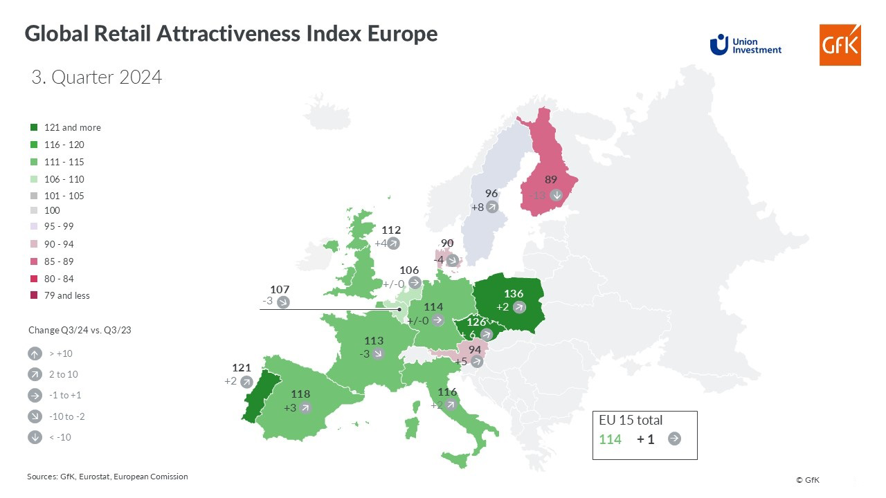 European retail markets are showing sustained recovery, as the Global Retail Attractiveness Index (GRAI) for Europe reached 114 points in Q3 2024, up from 113 points a year prior. According to Union Investment and GfK, consumer confidence is driving this growth, with eight European countries seeing moderate to strong gains. Sweden and the Czech Republic led the charge, posting increases of 8 and 6 points, respectively. However, declines were noted in Finland (-13 points), Denmark (-4 points), France, and Belgium (-3 points each).