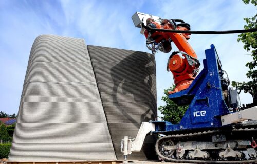 HSF’s heaviest bet is on concrete printing. Through a partnership linking HSF System with ICE Industrial Services (MTX Group), the spin-off Coral Construction Technologies is commercializing a Czech-patented printhead and process geared to use standard ready-mix rather than the dry mixes common in early-stage 3DCP—an engineering choice aimed at scalability on real sites. ICE is already printing the upper station of a cable-car project in Kopřivná, combining hall-made prefab with on-site printing, which shows the technology moving beyond “demo benches” toward complex, occupiable structures.