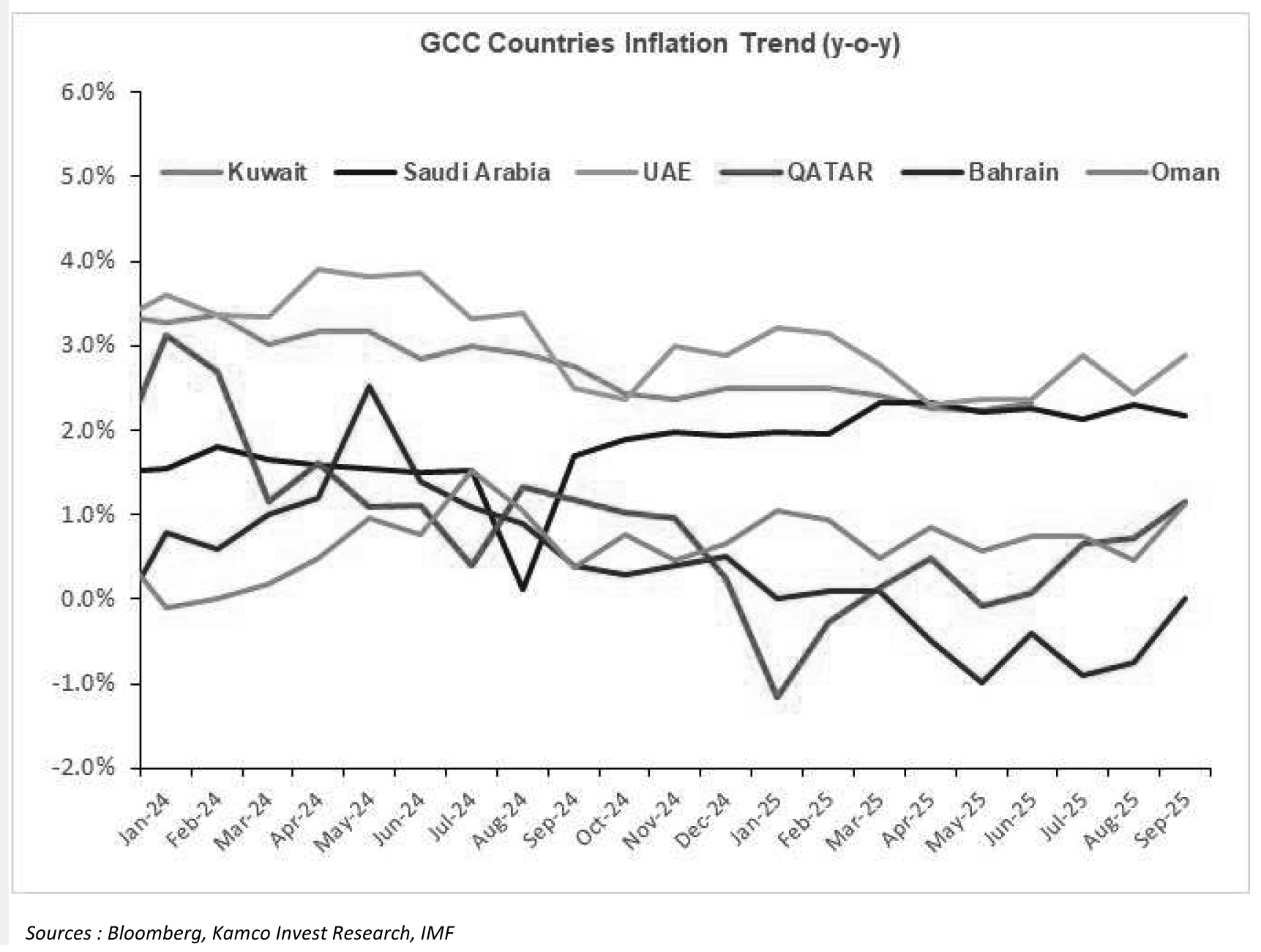 Kamco Invest’s analysis shows that while global inflationary pressures persisted — particularly in advanced economies such as the United States, where inflation reached 3% in September 2025 — the GCC maintained relative price stability. Central banks across Saudi Arabia, the UAE, Qatar, Bahrain, and Oman followed the U.S. Federal Reserve’s 25-basis-point rate cut in October, easing borrowing conditions across the region. Kuwait, however, kept its policy rate unchanged.