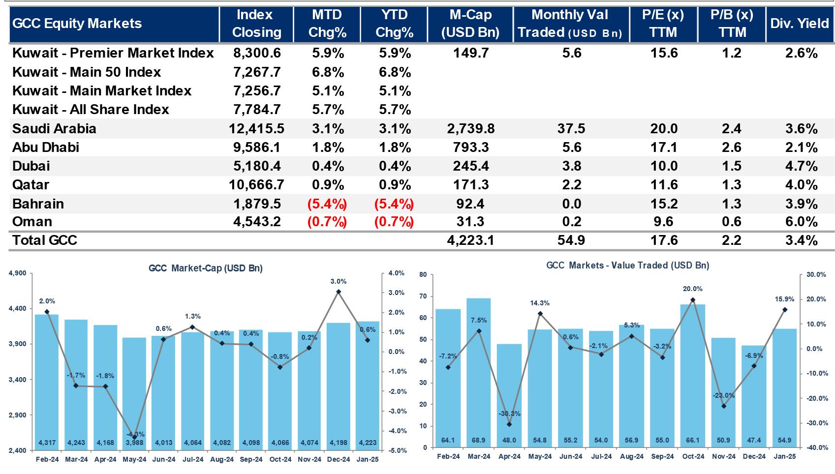 The GCC equity markets started the year on a strong footing, mirroring global trends and rebounding from the declines witnessed in December 2024. According to the latest GCC Markets Monthly Report – January 2025 by Kamco Invest, most regional stock markets recorded gains, with Kuwait leading the pack with a 5.7% surge—the highest monthly gain in a year.