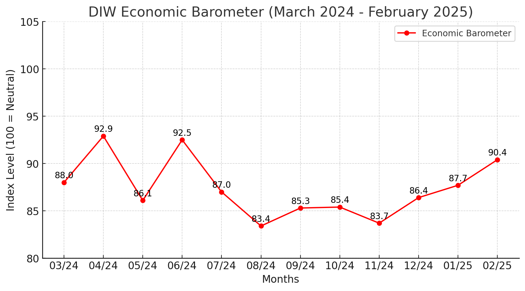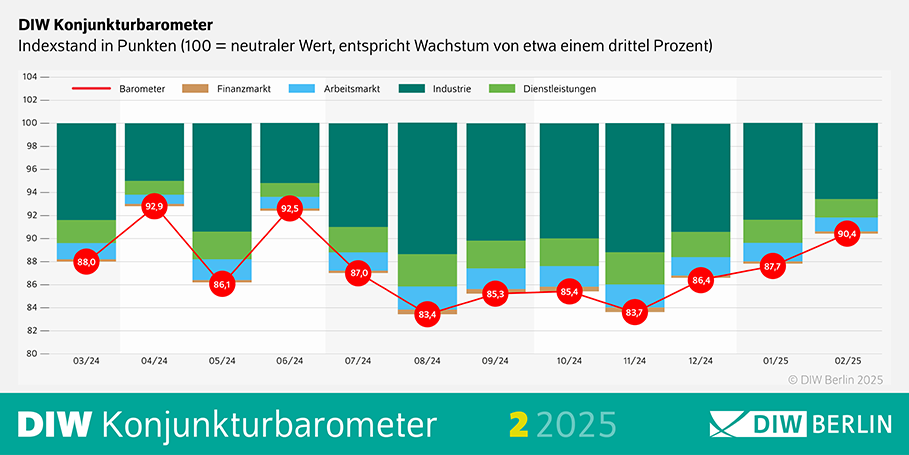 The German economy is showing early signs of recovery, according to the latest DIW Economic Barometer, which rose for the third consecutive month in February, reaching 90.4 points, an increase of 2.7 points from January. Despite this upward trend, the index remains well below the 100-point threshold, which represents average economic growth.