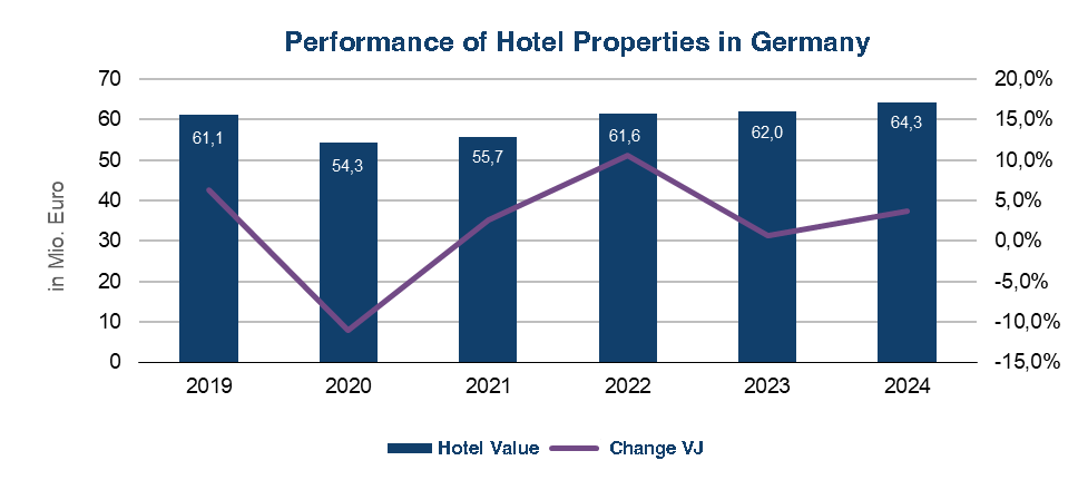 Hotel revenue performance improved considerably in 2024, approaching pre-pandemic levels. This recovery was reflected in the overall value of hotel assets. According to an assessment by Union Investment and bulwiengesa, the value of the investment-relevant hotel portfolio (excluding new developments) rose by 1.5 percent. The average value per hotel room increased to €152,000—surpassing the 2019 pre-pandemic figure of €150,800—for the first time.