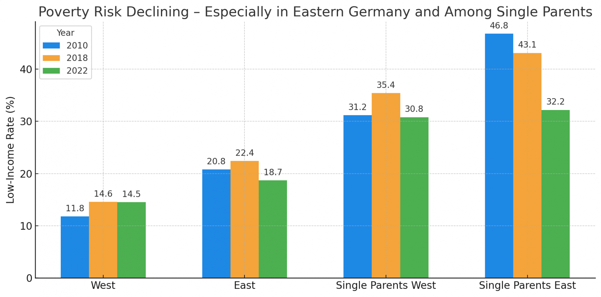 The poverty rate for single parents has fallen from a peak of 37% in 2018 to 31% in 2022, with an even steeper drop in eastern Germany, where it declined from 43% to 32% over the same period. Government support measures, including expanded maintenance payments and increased tax relief for single parents, appear to have contributed to these improvements.