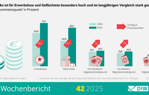 The share of people facing financial insecurity has stagnated since the pandemic period. Among those without a migration background, the poverty risk remains below 13 percent, but for people with a migration background, it hovers around a quarter of the population. For refugees, the picture is starker. The IAB-BAMF-SOEP Refugee Survey, which tracks their economic situation, estimates that as many as 60 percent of refugee households live below the poverty threshold — an improvement from earlier years, yet still alarmingly high.