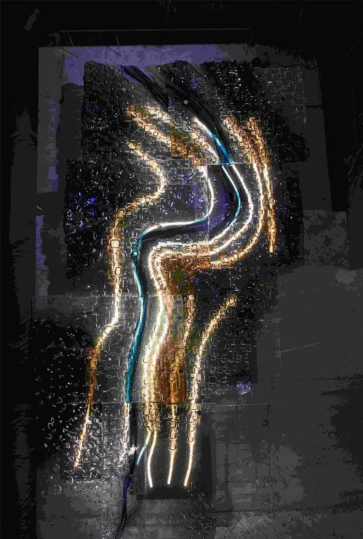The relief is positioned on the ceiling above the wellness zone pool, located in the building’s basement, a space formerly used as a civil defense shelter. The design depicts the Vltava riverbed near Vrané nad Vltavou, a section of the river visible from the upper floors of Vanguard. Made of fused and layered glass, the piece is backlit to resemble a landscape map seen from above.