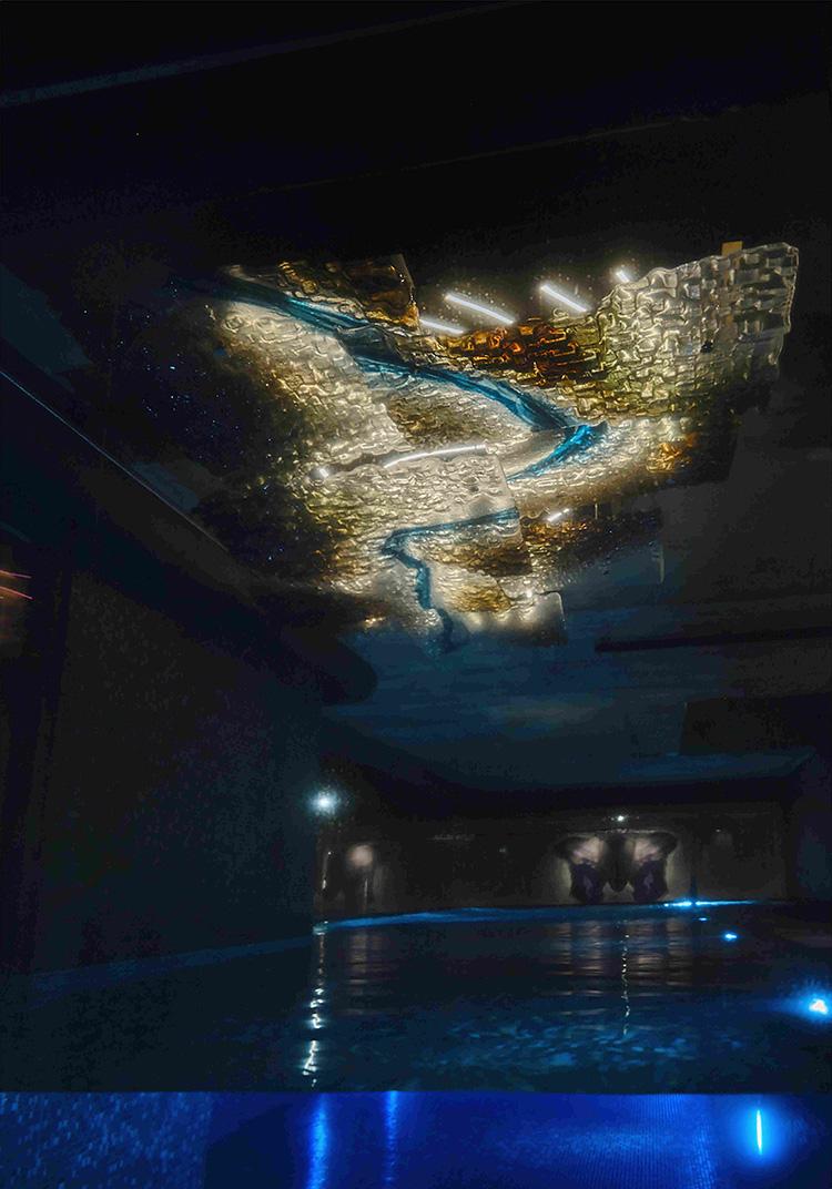 The relief is positioned on the ceiling above the wellness zone pool, located in the building’s basement, a space formerly used as a civil defense shelter. The design depicts the Vltava riverbed near Vrané nad Vltavou, a section of the river visible from the upper floors of Vanguard. Made of fused and layered glass, the piece is backlit to resemble a landscape map seen from above.