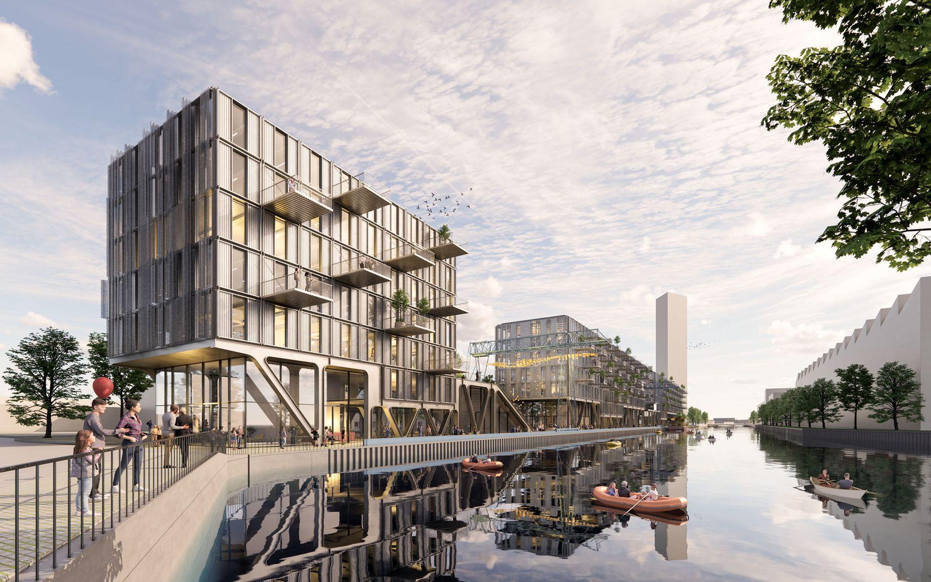 The scheme is designed to redevelop a former recycling yard into an urban quarter with more than 30,000 square metres of gross floor area. It combines residential accommodation with office and retail space, gastronomy, and public amenities. Plans also include a canalside promenade and an urban square, intended to integrate the site into the wider Neukölln district.
