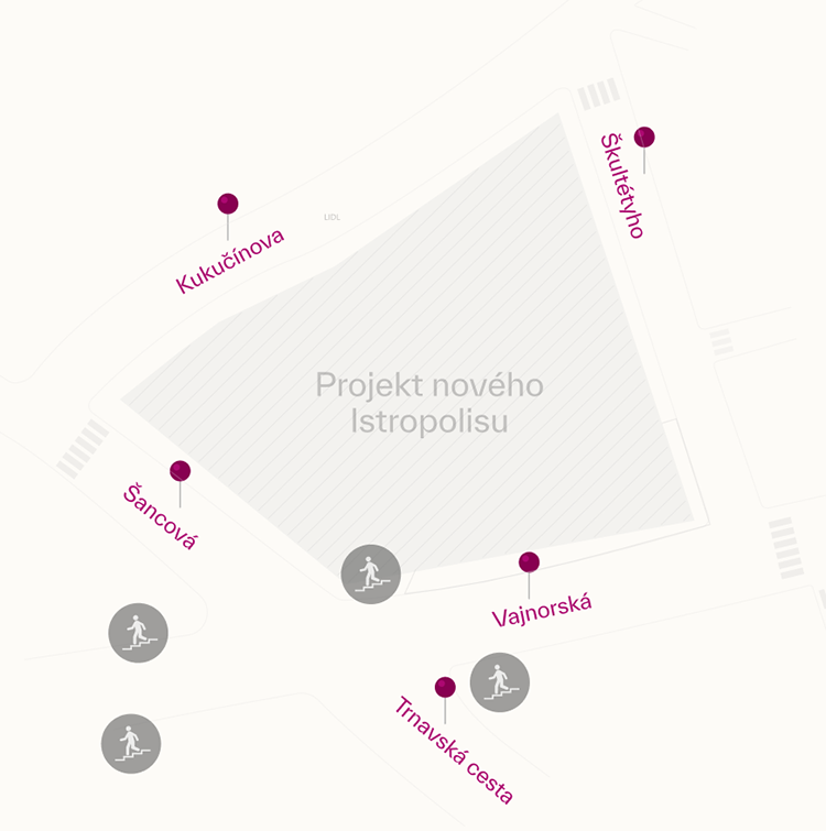 Traffic and pedestrian circulation in the surrounding area will be improved as part of the redevelopment. Planned changes include the modification of sidewalks, the addition of bicycle paths, and upgrades to intersections to increase safety and accessibility. The aim is not only to deliver a modern city quarter but also to enhance everyday mobility in this central part of Bratislava.