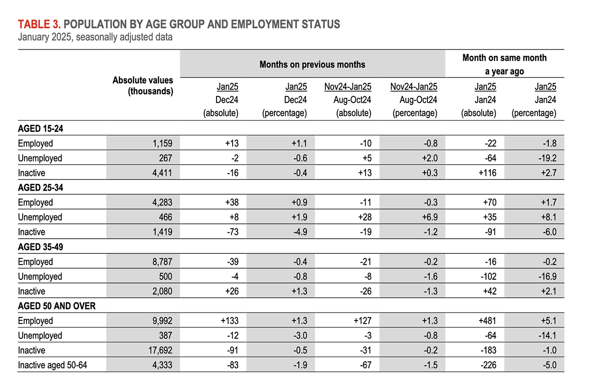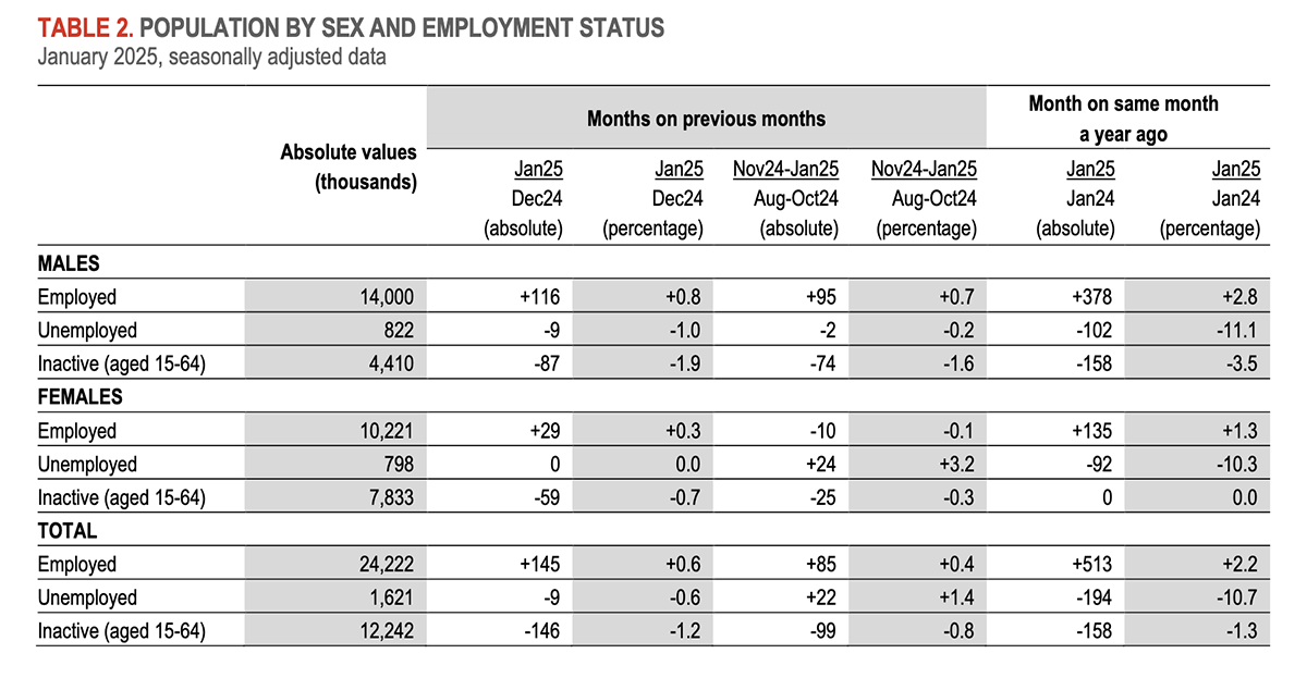 Looking at the broader quarterly trends from November 2024 to January 2025, employment rose by 0.4%, adding 85,000 new jobs compared to the previous quarter of August to October 2024. However, the number of unemployed persons increased by 1.4%, equating to 22,000 additional unemployed individuals. At the same time, inactivity among people aged 15-64 declined by 0.8%, reflecting a reduction of 99,000 individuals.