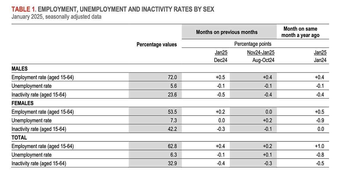 The employment market in January 2025 experienced positive growth, with the number of employed individuals increasing while unemployment and inactivity rates declined. The employment rate rose to 62.8%, reflecting a 0.4 percentage point increase compared to the previous month.