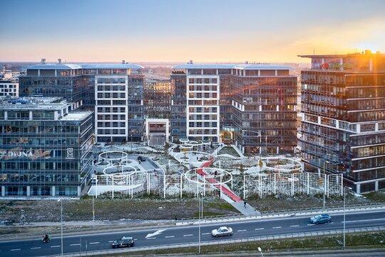 Formerly known as Marynarska Business Park, the Diuna complex has undergone significant modernization to meet current market standards. The refurbishment included revitalized outdoor areas, redesigned entrance lobbies, and the transformation of a 6,000 sq. m concrete car park into a lush, publicly accessible green space featuring 50 trees, 96 species of shrubs, a stream, and an educational pavilion.