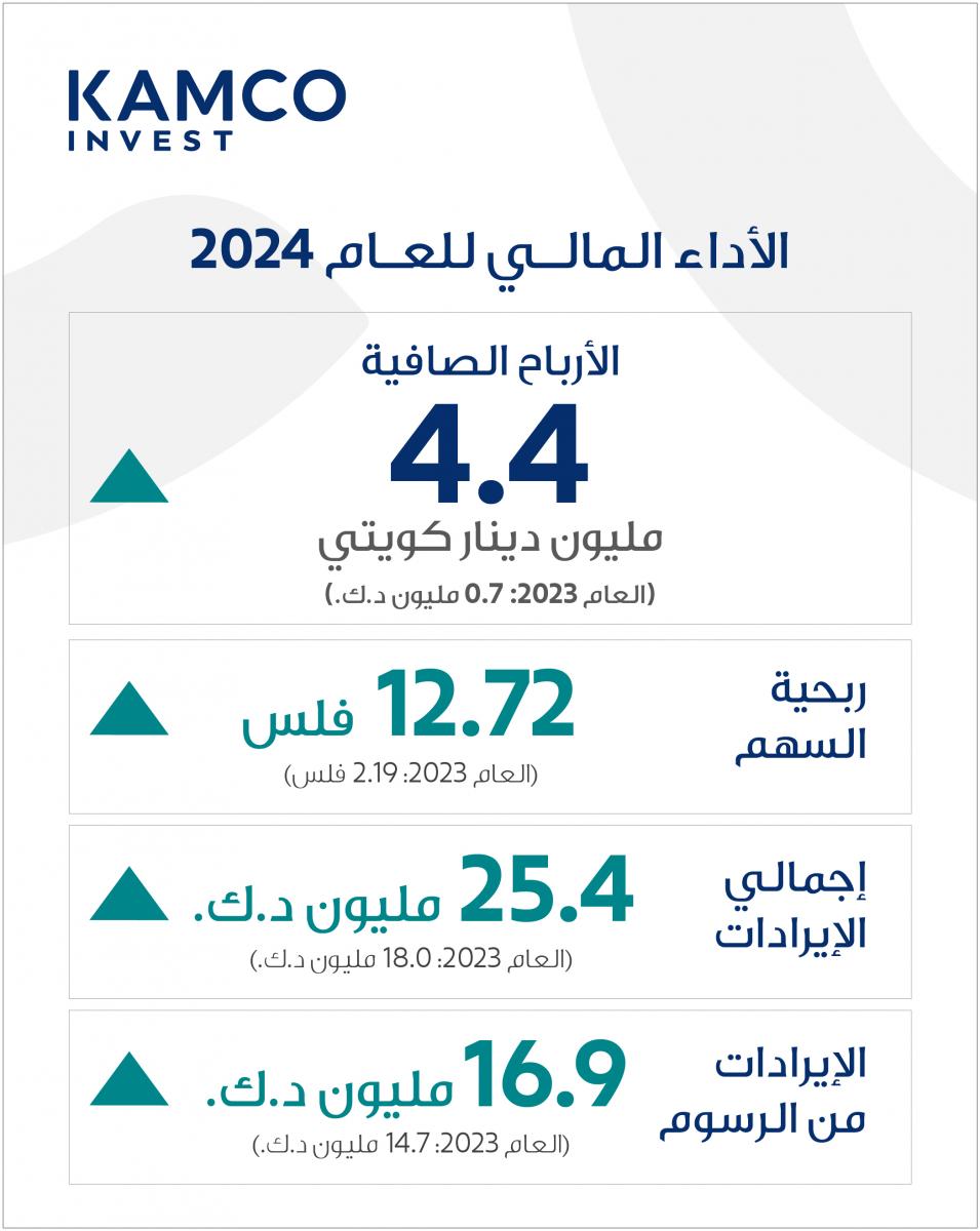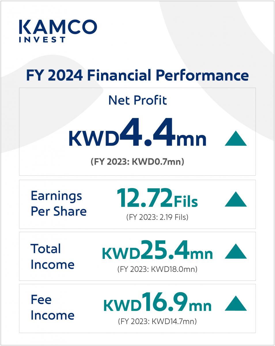 Kamco Invest, a regional non-banking financial services provider, reported a net profit of KWD 4.4 million (USD 14.4 million) for the financial year ending 31 December 2024, a significant increase from KWD 748 thousand (USD 2.4 million) in 2023. Earnings per share rose to 12.72 fils, up from 2.19 fils the previous year.