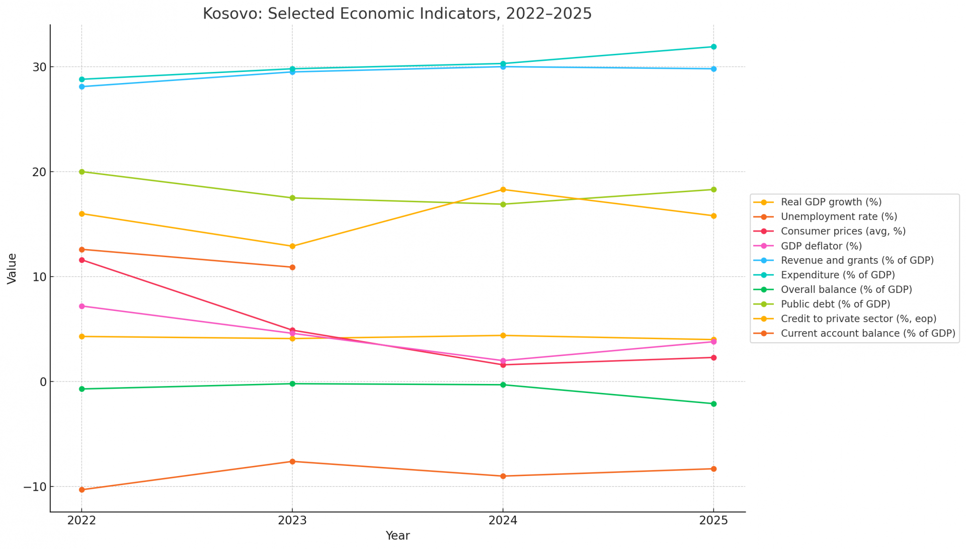 Despite these achievements, Kosovo’s current account deficit widened to 9% of GDP, driven by rising imports and slowing remittance inflows. Export performance was dampened by weak external demand, particularly in minerals and metals. The fiscal deficit remained modest, and public debt declined to 16.9% of GDP in 2024, well below regional averages .