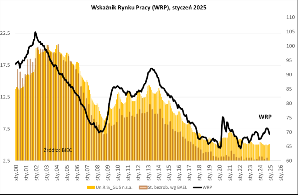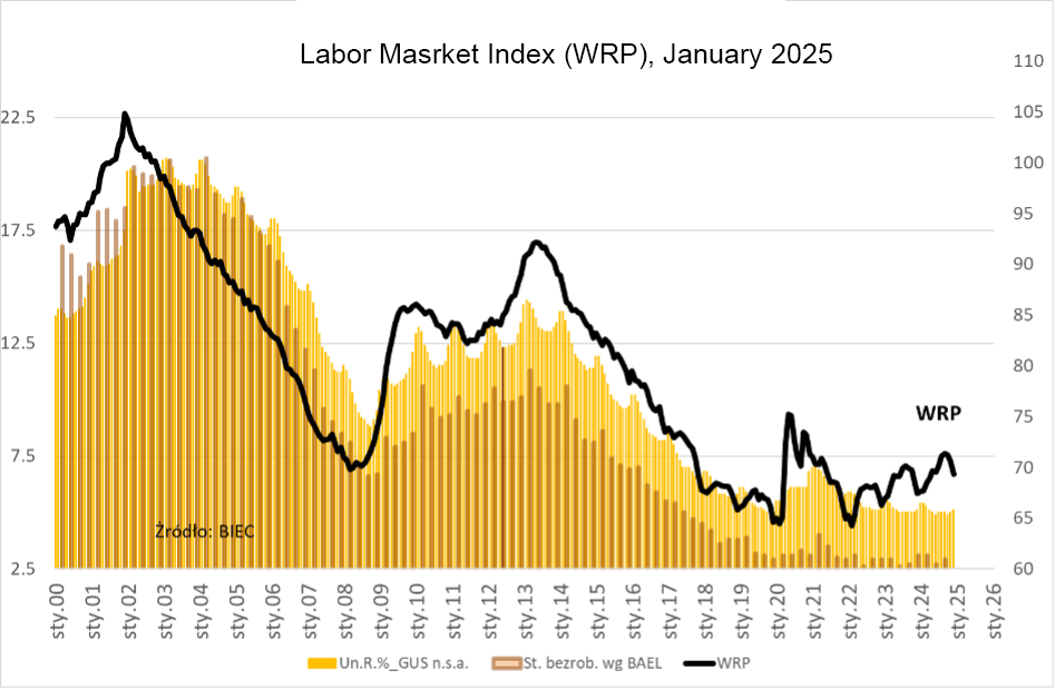 The Labour Market Index (LMI), an early indicator of future changes in unemployment levels, fell by 1.3 points in January 2025. Despite this monthly decline, 2024 was marked by a general upward trend in the index, suggesting a slight increase in unemployment over time. However, the overall scale of unemployment remains low, positioning Poland among the countries with the lowest unemployment rates in the European Union. The greater challenge lies not in joblessness itself but in labour shortages, low female workforce participation, early retirements, and a mismatch between available workers and employer needs.