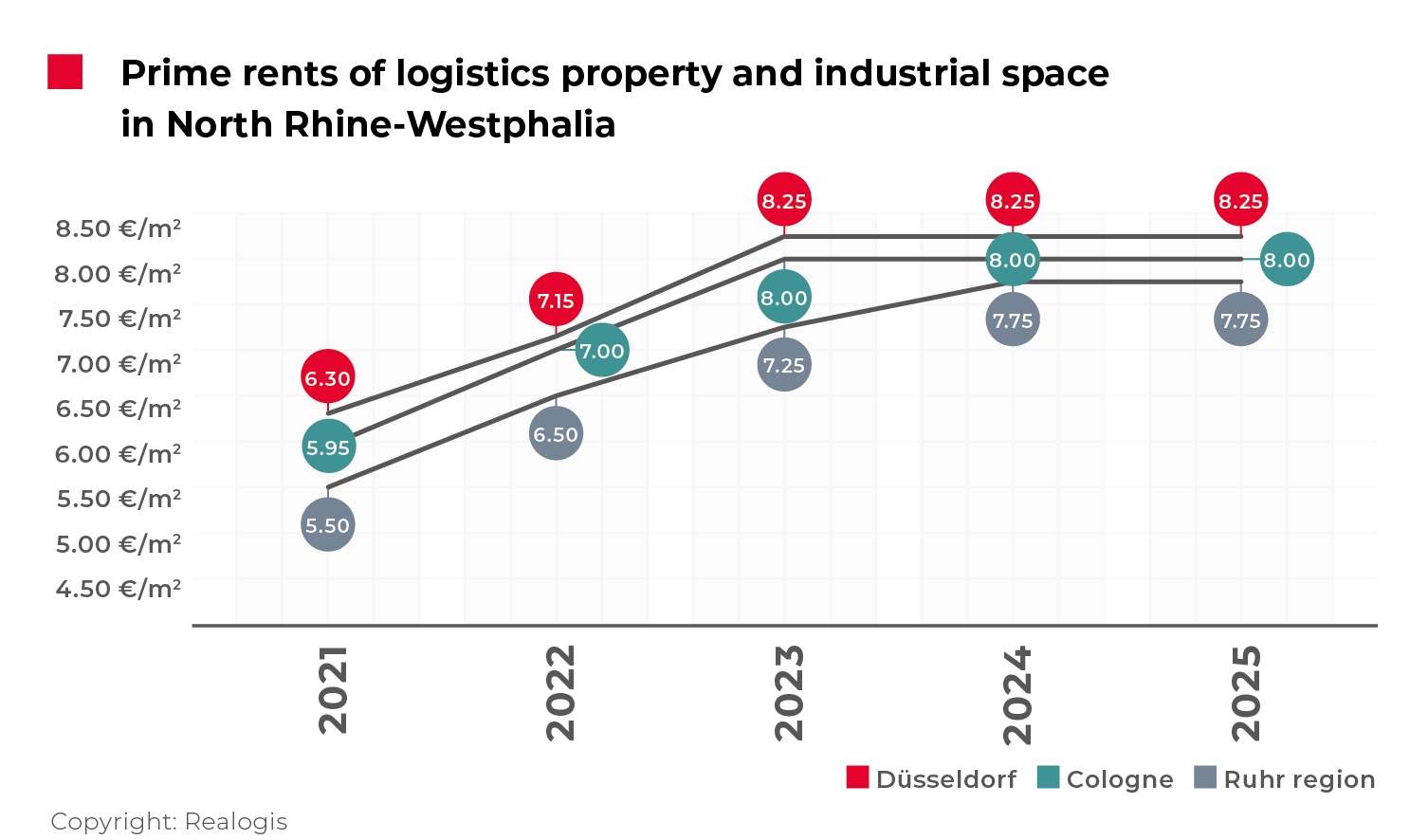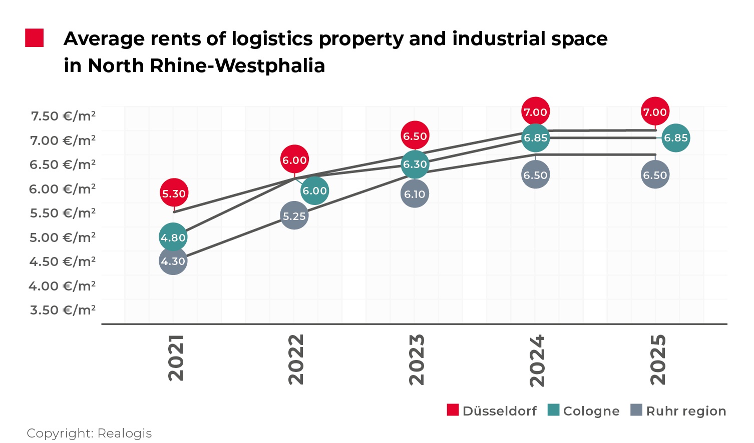 Rental levels remained stable across the three analysed markets. Düsseldorf continued to record the highest rents, with prime rents at €8.25 per sqm and average rents at €7.00 per sqm. Cologne reported €8.00 per sqm and €6.85 per sqm respectively, while the Ruhr area remained the most affordable at €7.75 per sqm prime and €6.50 per sqm on average. All figures were unchanged compared with both full-year 2024 and the first half of 2025.