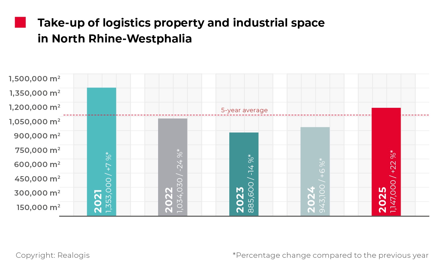 Logistics and industrial take-up in North Rhine-Westphalia reached 1,147,000 sqm in 2025, surpassing the 1 million sqm threshold for the first time in two years, according to REALOGIS. The analysis covers the submarkets of Düsseldorf, Cologne and the Ruhr area.