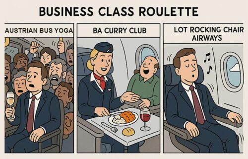 The moral? Forget glamour. Flying European business class is less about champagne flutes and more about survival instincts, bus choreography, and improvisational comedy. You’ll get your drink, but you’ll also get yoga poses on the tarmac, curry lotteries in the sky, and bags that arrive on “priority delay.” And honestly? That’s the real entertainment upgrade.