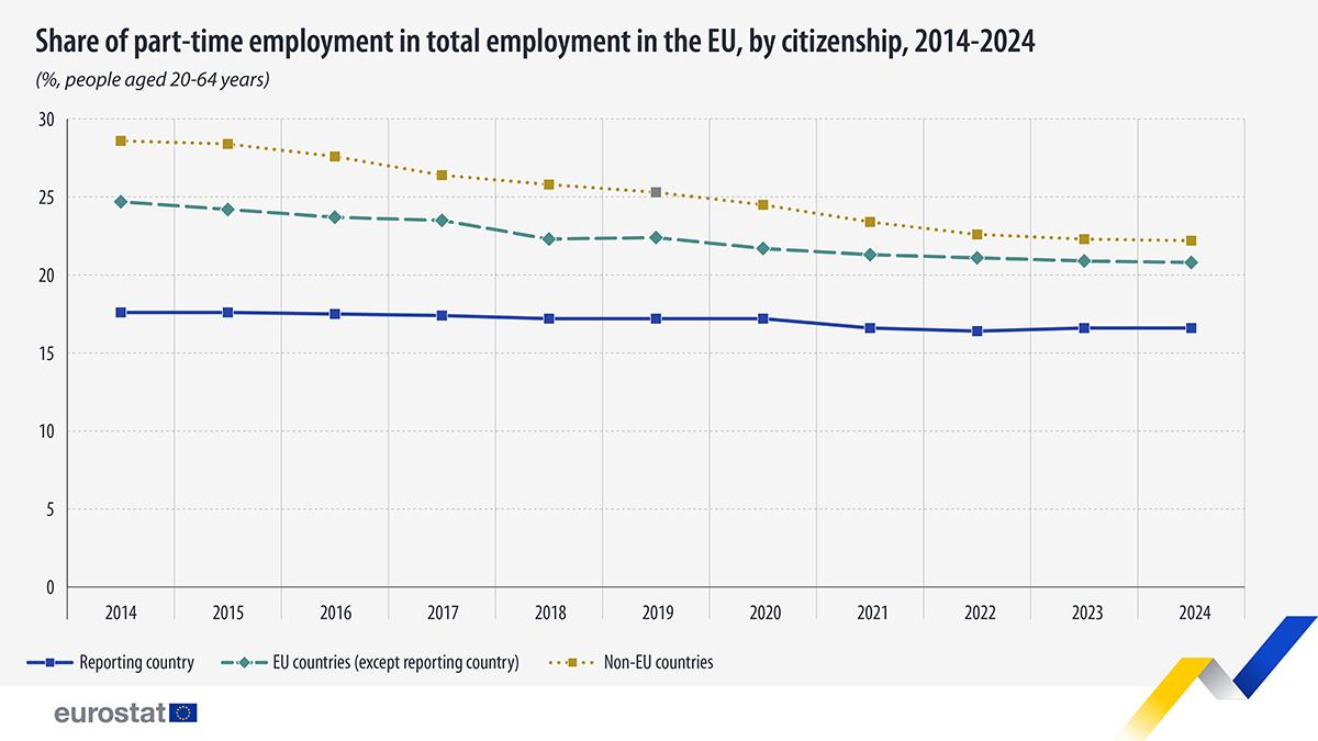 In 2024, non-EU citizens living in the European Union were more likely to work part-time compared to both EU nationals and EU citizens residing in other member states, according to data published by Eurostat.